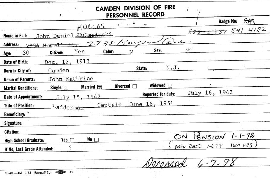 JOHN DANIEL HUELAS was born John D. Hulasinski on Camden on December 12, 1913 to John and Katherine Hulasenski. He shortened his name to Huelas after he had joined the Camden Fire Department. Known to his brother firefighters as Jake, John Huelas was appointed to the Camden Fire Department on July 15, 1942. He was then living at 2834 Howell Street in East Camden. He reported for duty the next day with Ladder Company 3 at North 27th Street and Federal Street in East Camden. He served with Ladder 3 until May 19, 1943 when he was transferred "across the floor" to Engine Company 9, quartered at the same East Camden location. He remained with Engine 9 until June 16, 1951 |