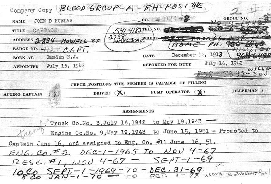 when he was promoted to Captain and sent to Engine Company 11 at 901 North 27th Street in Cramer Hill. Captain Huelas served with Engine Company 11 for almost 14 years. He spent twenty-three months at Engine Company 2, 619 Kaighn Avenue, from December 1, 1965 until November 1, 1967; followed by 22 months at Rescue Company 1, ending his assignment there on September 1, 1969. Captain Huelas finished 1969 at Engine Company 10 on Morgan Boulevard in Fairview. During this period Captain Huelas' son, William H. Huelas, became a Camden firefighter. He was appointed to the Camden Fire Department on November 8, 1968 and went on to have a long and distinguished career. The new decade saw a return to the Kaighn Avenue firehouse, this time with Engine Company 8, where he served until October 1, 1977. In anticipation of his retirement, Captain Huelas was assigned to the 2nd Battalion Pool on October 1, 1977. He retired on pension January 1, 1978 after having served the City of Camden for over 35 years. John D. Huelas moved to 2826 Thompson Street at some point after joining the Fire Department, and later moved to 2738 Hayes Avenue in Cramer Hill. Later in life he moved to Franklinville, and then to Pennsgrove, New Jersey. He passed away on June 7, 1998. |