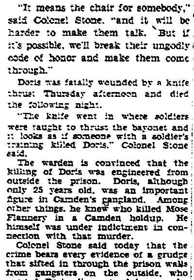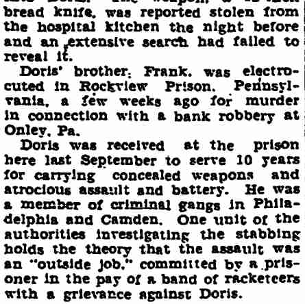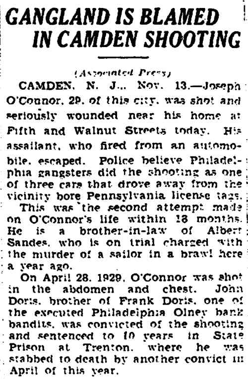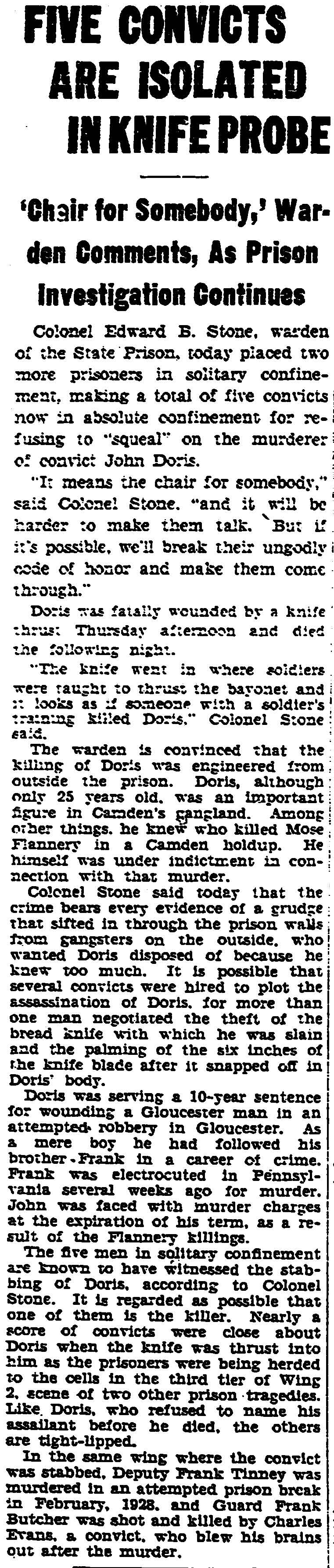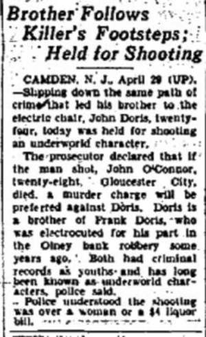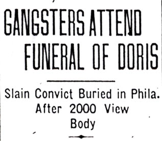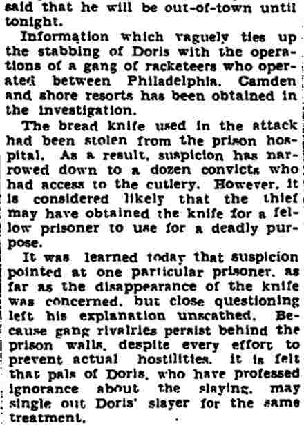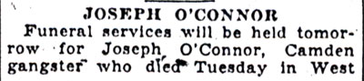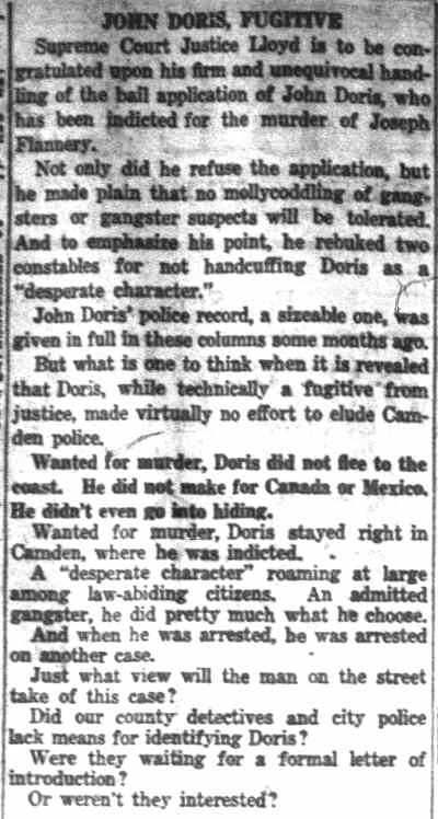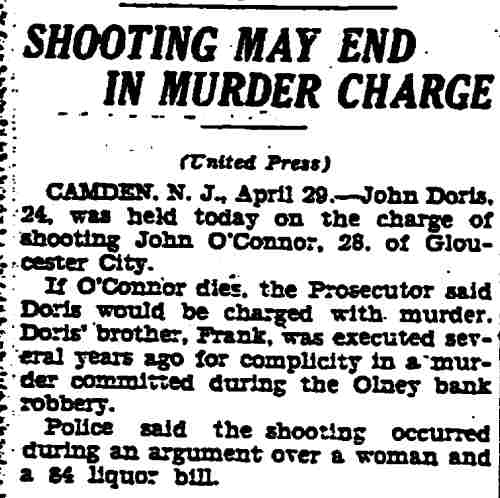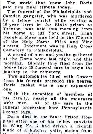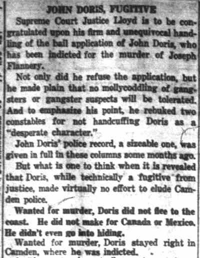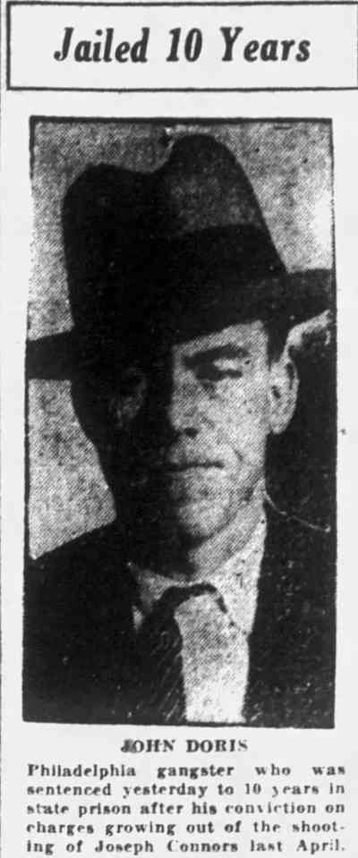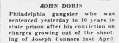 JOHN DORIS was born in Pennsylvania around 1906 to Joseph Doris Sr. and his wife Mary. His mother's name was reported as Mary in the 1910 Census and as Emma in later records. The 1910 Census shows the Doris family at 546 Randolph Street in Philadelphia. Of the six children born to the family, five were living, James, 10, Joseph Jr., 9; Frank, 6; John 4, and George, who was 11 months old at the time of the census. The Census gives Joseph Doris' occupation as "special police" and states that he worked in theatres. Joseph Doris Sr. passed away in February of 1917. The four of the Doris boys got into trouble as youths, and in the case of Joseph Jr., Frank and John, serious trouble. On December 19, 1918 Joseph Doris Jr. was wounded in a gun battle with Philadelphia police. Frank Doris was involved in a shooting in 1922, and in 1926 took part in a bank robbery where a Philadelphia policeman was shot and killed. For this offense he and three other members of the gang that robbed the bank were executed in 1927. The gang went to their deaths refusing to give up the name of the man who escaped. John Doris, who had a long record in Philadelphia, began coming over to Camden when his mother and younger brother moved to 132 York Street in the late 1920s. In April of 1929 he got into a fight with a local gangster, Joe O'Connor aka Joseph Connors. John Doris shot and seriously wounded O'Connnor. Even though O'Connor's refused to testify against him, John Doris was convicted and given a ten year prison sentence. John Doris was serving his sentence at Trenton State Prison when he was stabbed on April 10, 1930. Mortally wounded, he too refused to name his assailant, and no one was ever charged with his murder. Younger brother George, who also had a police record in Philadelphia, was arrested on robbery charges in Camden in June of 1930. Both George and his mother were using the surname McGovern when they moved to Camden, this may have been his mother's maiden name. |