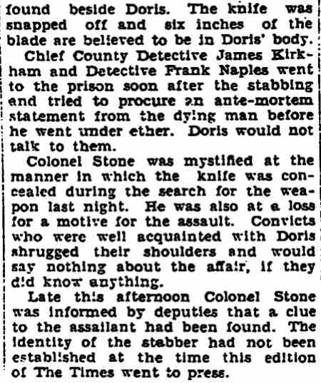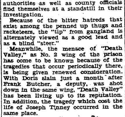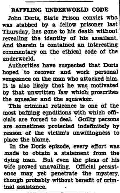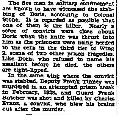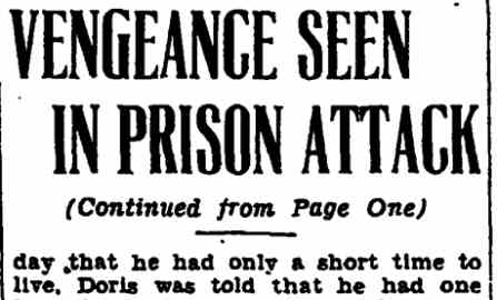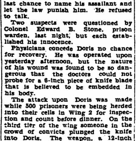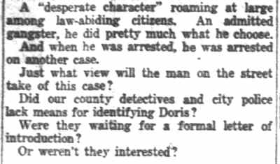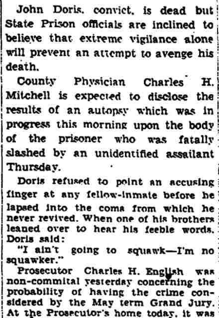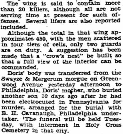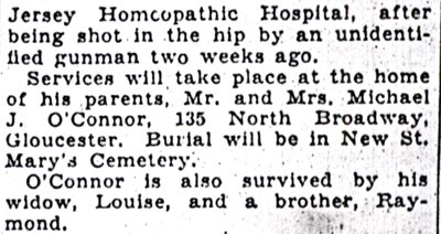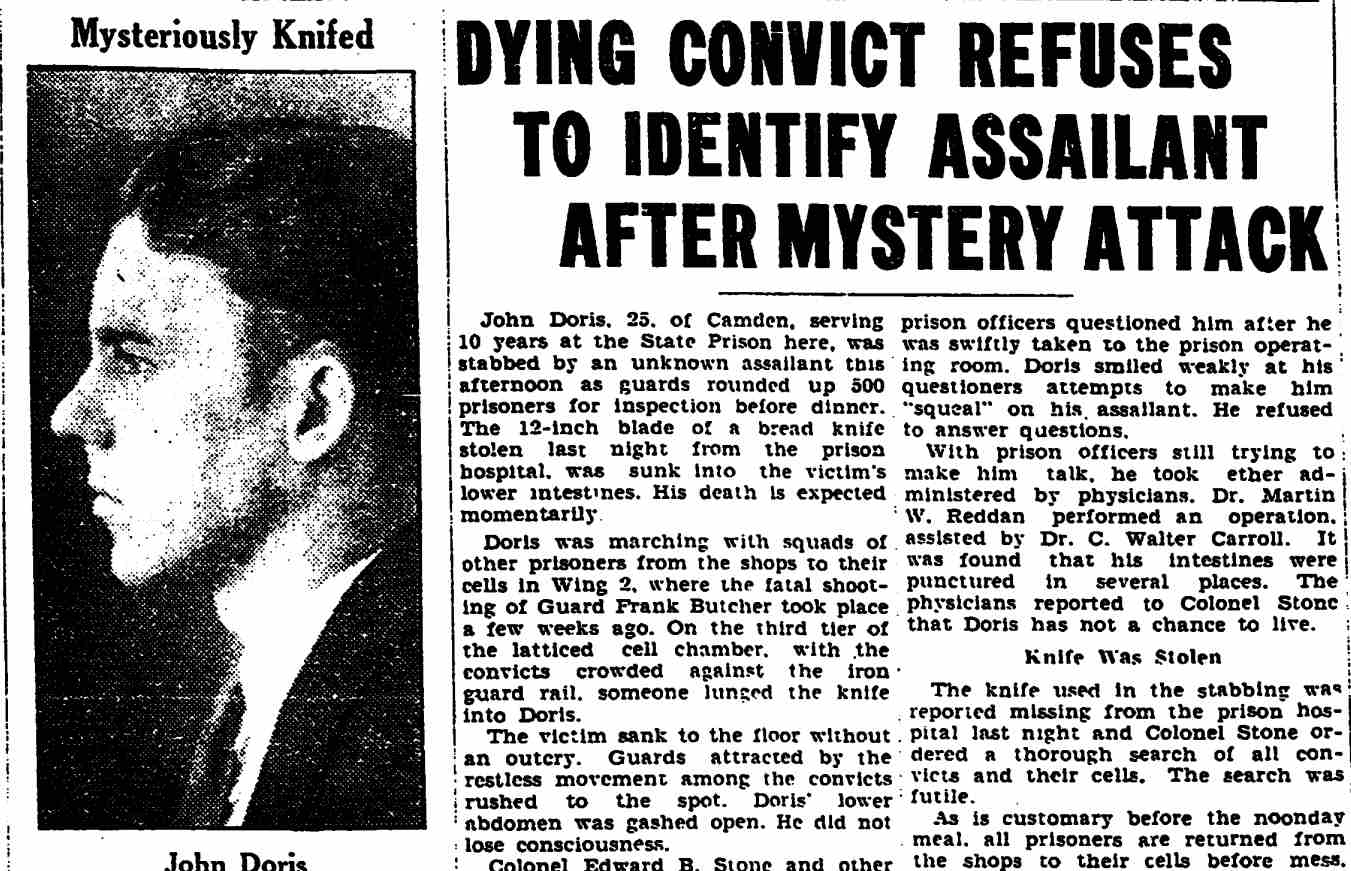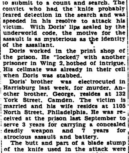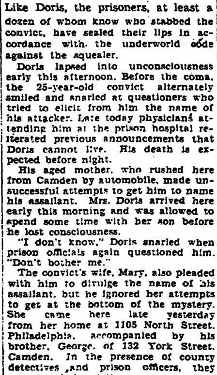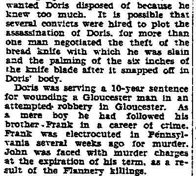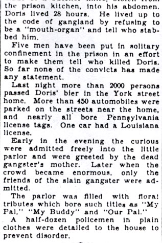 JOHN DORIS was born in Pennsylvania around 1906 to Joseph Doris Sr. and his wife Mary. His mother's name was reported as Mary in the 1910 Census and as Emma in later records. The 1910 Census shows the Doris family at 546 Randolph Street in Philadelphia. Of the six children born to the family, five were living, James, 10, Joseph Jr., 9; Frank, 6; John 4, and George, who was 11 months old at the time of the census. The Census gives Joseph Doris' occupation as "special police" and states that he worked in theatres. Joseph Doris Sr. passed away in February of 1917. The four of the Doris boys got into trouble as youths, and in the case of Joseph Jr., Frank and John, serious trouble. On December 19, 1918 Joseph Doris Jr. was wounded in a gun battle with Philadelphia police. Frank Doris was involved in a shooting in 1922, and in 1926 took part in a bank robbery where a Philadelphia policeman was shot and killed. For this offense he and three other members of the gang that robbed the bank were executed in 1927. The gang went to their deaths refusing to give up the name of the man who escaped. John Doris, who had a long record in Philadelphia, began coming over to Camden when his mother and younger brother moved to 132 York Street in the late 1920s. In April of 1929 he got into a fight with a local gangster, Joe O'Connor aka Joseph Connors. John Doris shot and seriously wounded O'Connnor. Even though O'Connor's refused to testify against him, John Doris was convicted and given a ten year prison sentence. John Doris was serving his sentence at Trenton State Prison when he was stabbed on April 10, 1930. Mortally wounded, he too refused to name his assailant, and no one was ever charged with his murder. Younger brother George, who also had a police record in Philadelphia, was arrested on robbery charges in Camden in June of 1930. Both George and his mother were using the surname McGovern when they moved to Camden, this may have been his mother's maiden name. |