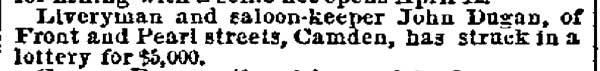 John Dugan was born in Ireland in May of 1845, according to the 1900 Census. He was living in New Jersey in the late 1860s when he married. His wife Annie bore him a son, William, around 1868. When the Census was taken in Camden's North Ward. John Dugan appears in the 1870 Census, living in Camden's North Ward, and working as a laborer. Eight more children followed the Census, John Jr., Hugh, Kate, Rebecca, Matthew, James (who sadly died, quite young), James A., and Marie. As stated above, John Dugan was living on Linden Street near Point Street when appointed to the Fire Department in April of 1876. Within the next two years he opened a livery, boarding and exchange stable on North Front Street south of Linden Street. He also bought and sold horses. The 1880 Census shows his address as 102 Linden Street. Also living at 102 Linden Street was Jacob Rettberg and his wife Margaret. Jacob Rettberg owned a large wagon works on Market Street, and it may well have been with his assistance that John Dugan went into business. In late 1884 or early 1885 John Dugan acquired the building at 100 Pearl Street, a block north from his previous residence, and opened a saloon, or, to use the parlance of the times, a hotel. This would be the Dugan family's address through at least 1900. John Dugan operated both business as late as 1893. By the latter half of 1894 he had divested himself of the livery, and concentrated on the bar business. His son, Hugh F. Dugan, operated a bar at 129 Walnut Street in the 1890s. John Dugan was active in local politics as a Democrat in the 1890s. He was still in the bar business and living at 100 Pearl Street when the 1900 Census was taken. Living at 100 Pearl Street at that time were John and Annie Dugan, sons Hugh, Robert, Matthew, and James A., daughter Mary G., daughter-in-law Catherine and Julia, and granddaughters Helen and Regina Dugan. Annie Dugan died not long afterwards, and son James A. Dugan passed in 1903. John Dugan seems to have retired by 1906, when the City Directory only states an address, 106 North 2nd Street. Son Hugh F. Dugan, who owned and operated a successful establishment, the Avenue Hotel, at 6 Delaware Avenue in Philadelphia, passed away in 1908. John Dugan and his family were gone from Camden, either having moved or died, by the time the 1910 Census was taken. John Dugan's son Robert and daughter Marie had moved to Philadelphia by that time. John Dugan was not related to John F. Dugan, who served with the Camden Fire Department many years after the John Dugan family had left Camden. |