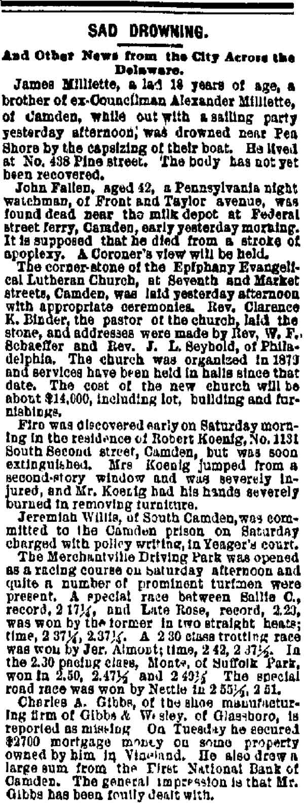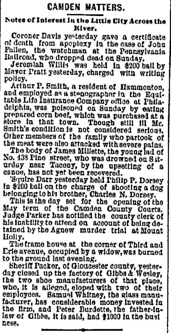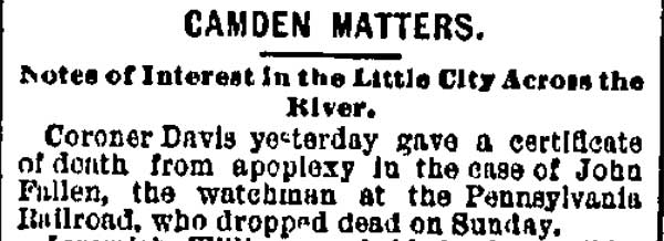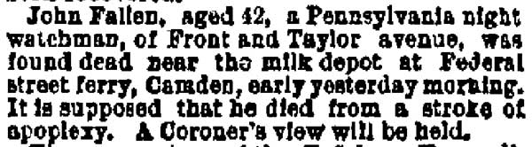 JOHN FALLAN was appointed to the Camden Fire Department at some point not long after November 12, 1874 as a replacement for William C. Lee as an extra man with Engine Company 2. He resigned on July 7, 1875. During his time with the Camden Fire Department, John Fallan lived at 525 Arch Street. Records of the time indicate that "John Fallan" was in fact M. John Fallen. The 1878 Camden City Directory shows a John Fallen, "railroader" at 112 Taylor Avenue. The 1880 Census shows the M. John Fallen family at 112 Taylor Avenue, living with his wife Kate and children Katie and Walter, and brother John Fallen, aged 20. Both men worked as laborers. M. John Fallen was 34 at the time of the Census, of the two, only he would have been old enough to have served as a fire fighter in 1874 and 1875. According to the Census he was born in Ireland in 1846. His wife was also born in Ireland, in 1851 according to the Census. The 1885 Camden City Directory shows a John Fallen, at 112 Taylor Avenue. John M. Fallen died of a stroke on April 29, 1887. The 1887-1888 City Directory lists Kate Fallen, widow of John, at 112 Taylor Avenue. |