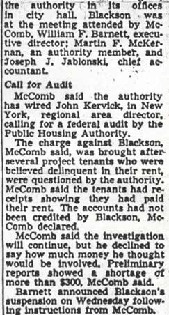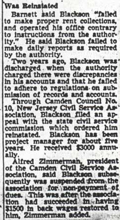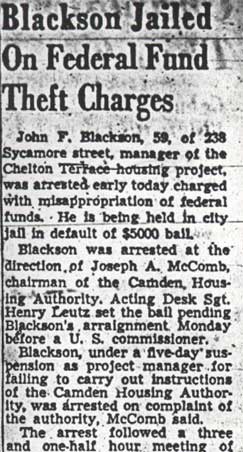 JOHN F. BLACKSON was born in Delaware on April 10, 1889. At the time of the 1930 Census he had moved to Camden NJ, where he had his own paperhanging business. He was then living wife wife Mary at 638 Cherry Street. He later moved to 238 Sycamore Street. In the mid-1940s he was selected to become the first manager of the Chelton Terrace Public Housing project at 8th and Chelton Avenue. He was discharged from his duties as manager in 1946, but was reinstated after appealing his case to the New Jersey civil service commission. He was suspended with intent to terminate again in 1948, and subsequently was arrested on charges of misappropriation of federal funds. John F. Blackson passed away in Camden NJ in November of 1967. |