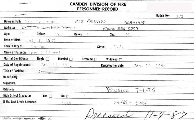 John F. Dugan was appointed to the Camden Fire department on January 13, 1951 and reported for duty three days later. He retired on July 1, 1975 after serving the City of Camden for 29 years and 7 months. John F. Dugan was living at 834 Olive Street when the 1956 New Jersey Bell Telephone Directory was compiled. By October of 1959 he had moved to 2407 Wainwright Street and lived there through at least the fall of 1970.. John F. Dugan passed away on January 4, 1987 according to the Social Security Death Index. John F. Dugan was not related to John Dugan, who served with the Camden Fire Department in the 1870s. |