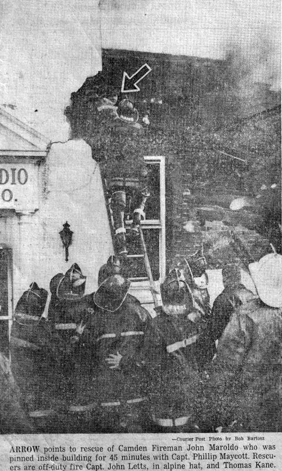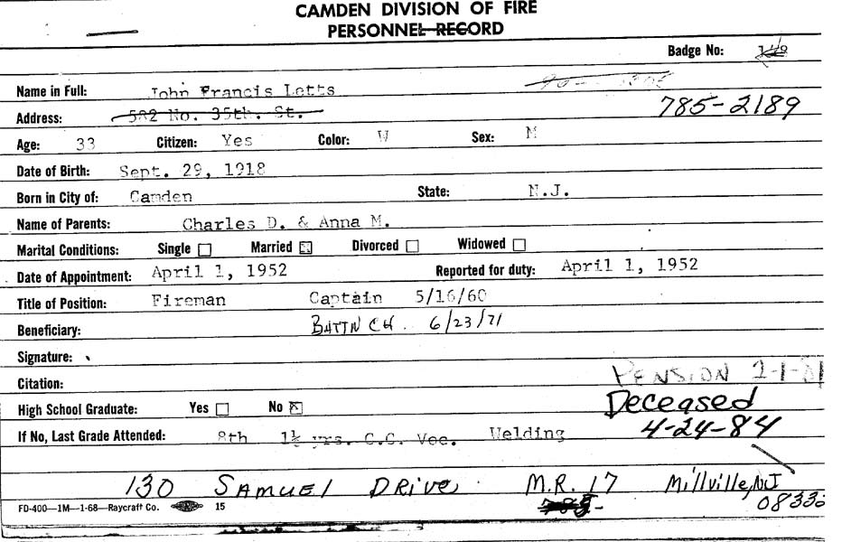JOHN FRANCIS LETTS was born in Camden, New Jersey on September 29, 1918 to Charles D. and Anna M. Letts. He grew up at 2208 Howell Street in East Camden. John Letts attended public schools in Camden through the eight grade, and then went to Camden County Vocational School, where he took up welding. In July of 1940 John Letts was working at the RCA-Victor factory in downtown Camden. On the day of the Hollingshead factory fire, he was on his lunch hour walking with a co-worker near Ninth and Market Streets when the blast occurred. The force of the blast sent the man out the window and backward across the street where he sailed through the plate glass window of a first floor barber shop, opposite the factory. John Letts ran the distance to the shop and found the victim laying on the floor bleeding heavily. The story goes that in the process of flying backward through the window, the razor sharp glass acted as a guillotine and amputated both of the man's ears. The startled barber had the presence of mind to grab a pair of dusty, fur lined earmuffs that had been hanging on a wall hook in the shop over several previous winters. With the help of a customer, the barber placed the muffs over the victim's bloody head where his ears had been, and secured it tightly with a roll of masking tape. John F. Letts was appointed to the Camden Fire Department on April 1, 1952 and reported for duty the same day. He was promoted to captain on May 16, 1960, and to Battalion Chief on June 23, 1971. On the night of March 27, 1977 Chief Letts, in command of the 3rd Battalion, responded to an "all hands-Box #5212" transmitted at 11:37 PM. Firemen George Abbey and Denny Penn of Engine 7, and Jim Nash of Engine 8 rescued a trapped and unconscious woman from the burning house at 1440 Sheridan Street. Hustle on the part of all units resulted in the saving a life and the quick confinement of fire. Fireman Denny Dowhy of Ladder Company 2 also rescued a dog from the inferno. Chief Letts was also active in the firefighters' union, as part of the Camden Fire Officers Association, which became Local #2578 of the International Association of Fire Fighters on June 28, 1977. Chief Letts was the new Local's first treasurer, the first president being Captain Kenny Clark, then of Ladder Company 3 and the first secretary Captain Randy Brooks of Ladder Company 1. After serving the City of Camden faithfully for over 29 years, Chief Letts retired on February 1, 1981. From the 1950s into the 1970s John F. Letts lived at 582 North 35th Street in East Camden. His neighbor at 558 was Camden Fire Department member Henry Keubler. When residency restrictions were lifted on Camden fire fighters in the 1970s, John F. Letts moved from the city. His last days were spent in Millville, New Jersey. John F. Letts passed away on April 24, 1984. |