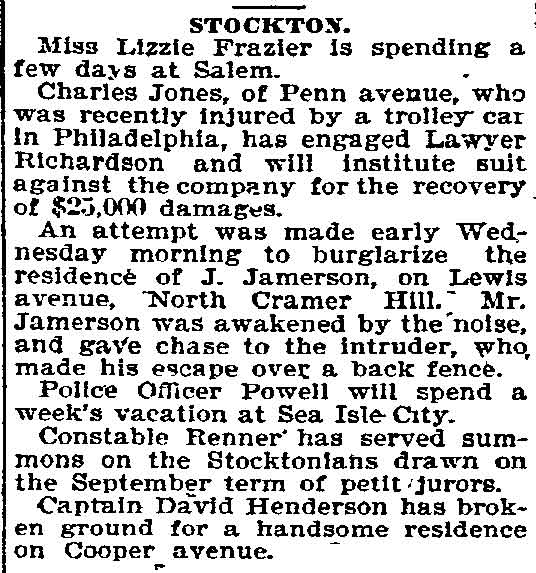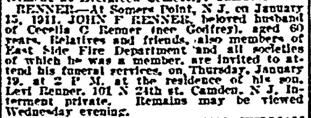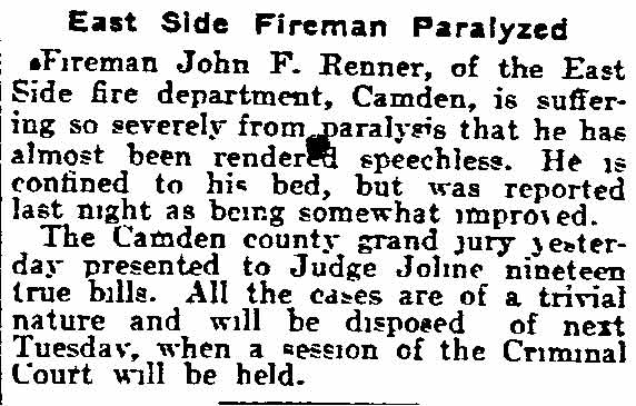 JOHN F. RENNER SR. was born on January 8, 1851 in Pennsylvania to Levi Renner and his wife, the former Mary Ann Rose. He was the oldest of at least seven children. The Renner's lived in Philadelphia as early as 1850, and were still there in 1880, before coming across the river in the 1880s.. John F. Renner married Cecelia Godfrey in the late 1860s. The family lived in Pennsylvania as late as 1879, when son Levi G. Renner was born. By June of 1880 the Renners had come to the town of Stockton, which was comprised of what is today known as the Cramer Hill and East Camden sections of Camden, New Jersey. The 1880 Census shows four children, Edwin H., 10; Emma, 7; John F. Jr., 4; and Louis, 1. Another son, Levi, was born in the early 1880s. Later in the decade younger brother Enos Renner brought his family and father Levi Renner over to Stockton as well. In the 1880s and 1890s John F. Renner worked as a butcher. 1887 found him at the corner of 24th and Federal Streets, 1887 on Federal Street near 26th Street. When the 1890 City Directory was compiled, John F. Renner and family were living in a house whose address would become 137 North 28th Street. In those times that section of North 28th Street was called First Street, it was renamed shortly after Stockton was annexed by Camden in 1899. The Renner family lived in this home through the spring of 1910. Involving himself in local politics, John F. Renner served as a constable from 1891 through 1899. In 1892 John F. Renner helped found the Stockton Hose Company No. 2, a volunteer fire company in Stockton, and briefly served as Chief Engineer of Stockton in the early 1890s. The 1897 Directory shows that he also was in the real estate business with David B. Ristine at 2709 Westfield Avenue. As stated above, in the late spring of 1899 Camden annexed the town of Stockton, and John Renner's position as a constable disappeared, however, he shortly found a new position with the City of Camden. On November 27, 1899 John F. Renner Sr. was appointed to the Camden Fire Department, as part of a five company expansion. He remained a member of the Fire Department for the rest of his life. The Census taken in June of 1900 shows John F. Renner, a Camden fireman, living with his wife Cecelia, daughter Emma, ands sons John Jr. Louis, and Levi were living at at 137 North 28th Street in East Camden. Five other children including son Edwin had died. Two grandchildren, John F. III and Edwin were also there when the Census was taken. The 1906 City Directory indicates that John F. Renner Sr. and family were living at 137 North 28th Street in East Camden. His son John F. Renner Jr., then employed as a painter, was living with him. Son Levi "Lee" Renner, then a ship joiner, was living at 2927 High Street. Louis Renner had been serving in the United States Army when the 1900 Census was taken, he does not appear in the Directory. He later resided in Pennsauken. The 1910 Census shows John F. Renner, wife Cecelia, and grandson Edwin living at 137 North 28th Street. John F. Renner passed away on January 15, 1911 at Somers Point, New Jersey. Funeral services were held at the home of his son Levi Renner, 101 North 24th Street. |