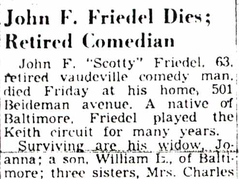 JOHN F. "SCOTTY FRIEDEL was born in Baltimore MD around 1888. He worked as a comedian on Keith Vaudeville circuit for many years. He retired to Camden NJ, where he resided at 501 Beideman Avenue in the Westfield Acres public housing project. John Friedel passed away July 20, 1951 in Camden NJ. . |