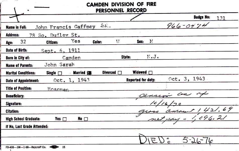 Witnessing, from left: Fireman George Wade, Fireman Harrison MacNeir, Fireman John Gaffney Sr., Fireman James Troutman, Fireman Ernest Tartaglia, Captain Allen Hess, Fireman John Yates, District Chief Harry Wagner (obscured), District Chief Edward Michalak, Fireman Dominick Dalanni, Fireman Howard Lewis, Fireman Henry Keubler |