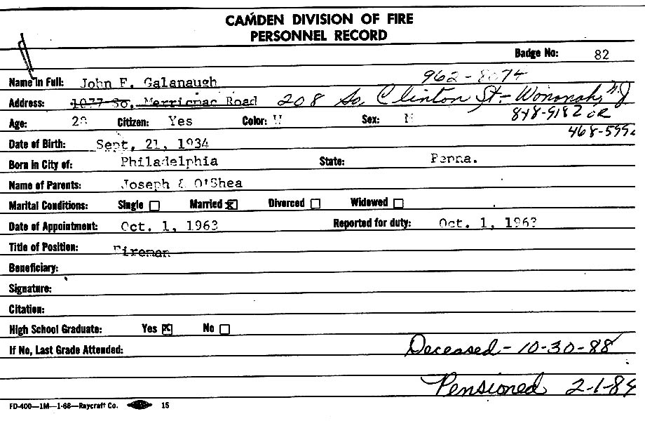 Galanaugh retired on pension February 1, 1984. His latter years were