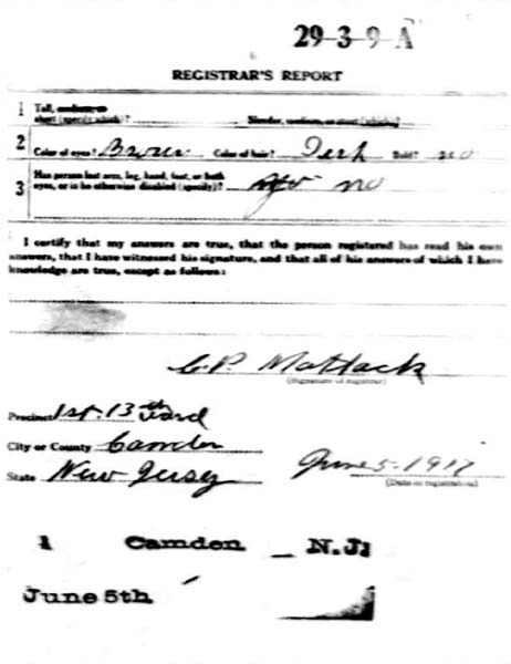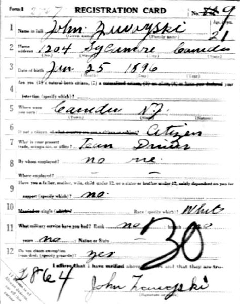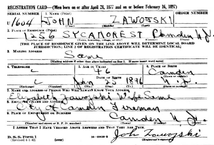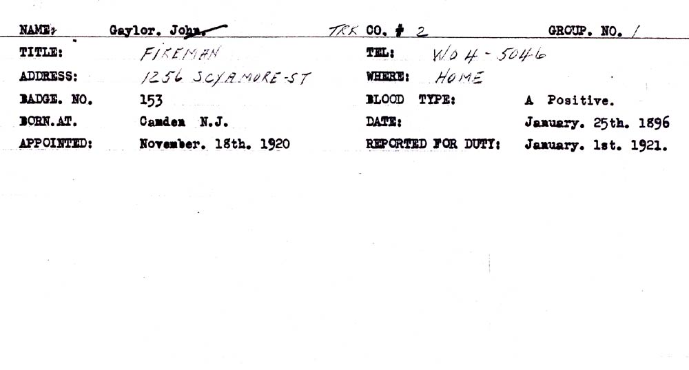 JOHN GAYLOR was born John Zawojski in Camden on January 25, 1896 to John and Emma Zawojski. The 1900 Census shows the family, which included older brother Frank, at 1256 Sycamore Street in Camden. When he registered for the draft on June 5, 1917 he was living at 1204 Sycamore Street. He had been working as a teamster but was unemployed at the time. He married soon afterwards. John Zawojski appears to have anglicized his name to Gaylor shortly afterwards. Although he is listed as Zawojski in the 1930 Census and on his 1942 draft card, City Directories from 1942 forward carry the Gaylor surname. John Gaylor was appointed to the Camden Fire department on November 16, 1920 and reported for duty on January 21, 1921. By 1924 he was making his home with his wife Elizabeth and daughter Marie made his home at 1256 Sycamore Street. Among his assignments during his career as a fire fighter in Camden was time spent at Ladder Company No. 2 at 619 Kaighn Avenue in South Camden. When he registered for the draft in the spring of 1942 he was still at the Sycamore Street address. John Gaylor died at home on August 20, 1951. He was survived by his wife, daughters Marie, Renee, and Sandra, and a son Donald. |