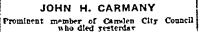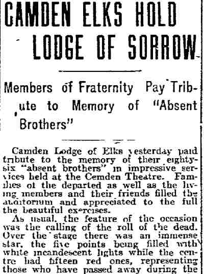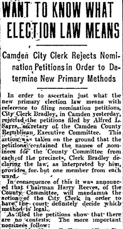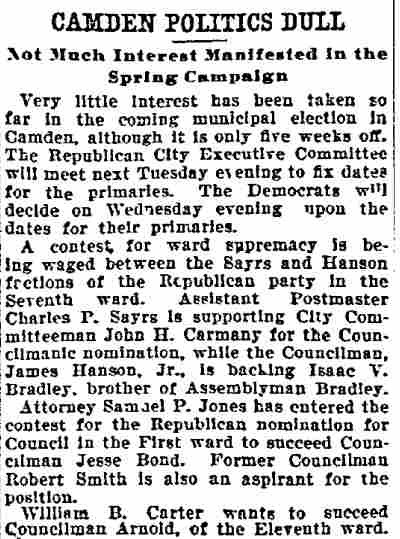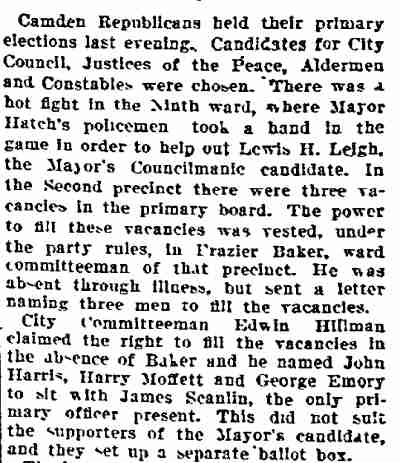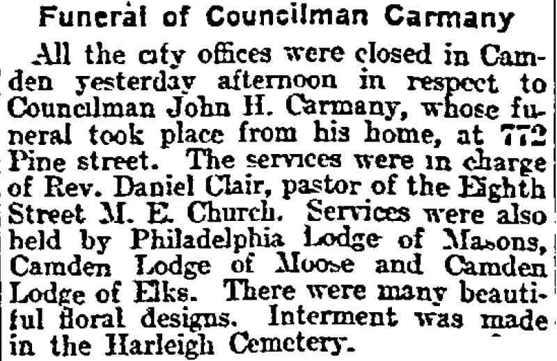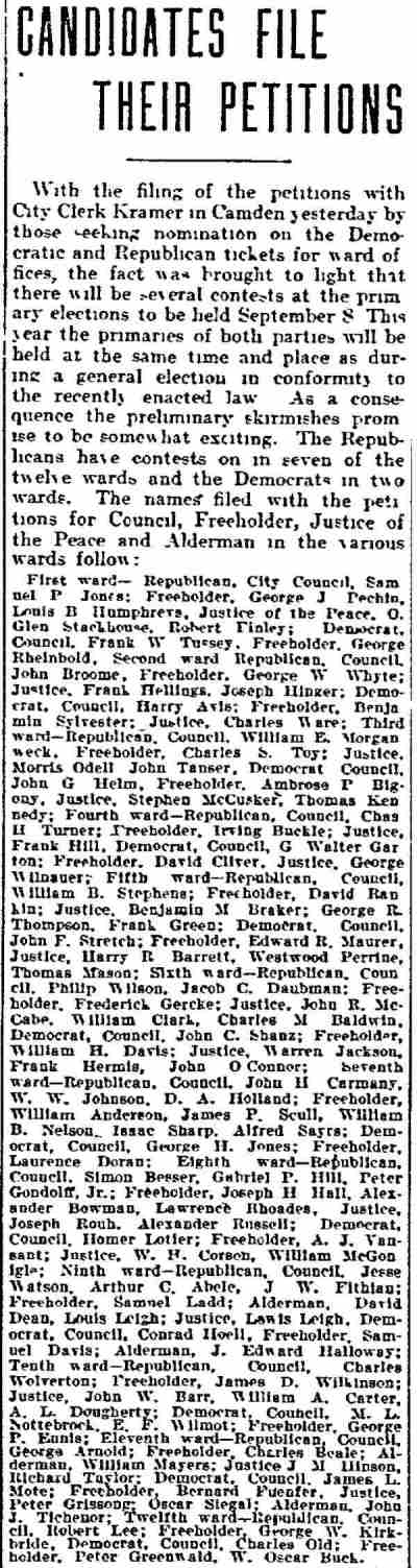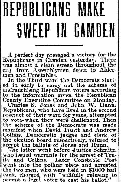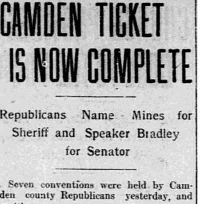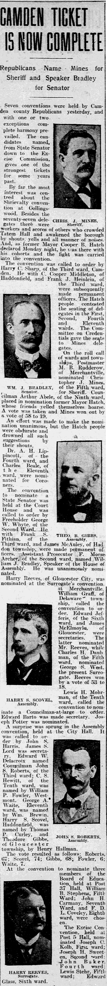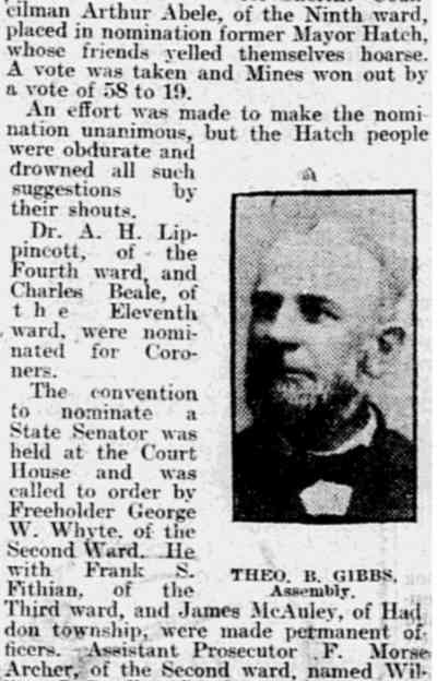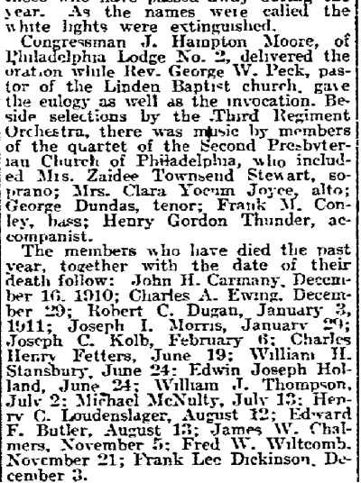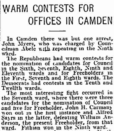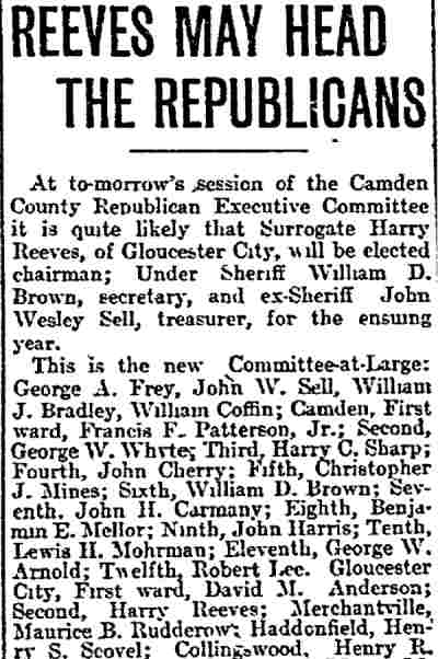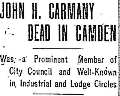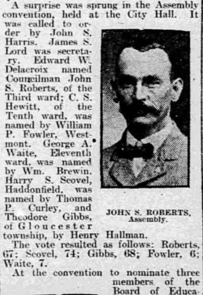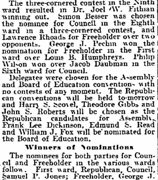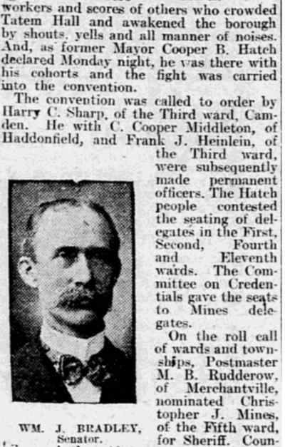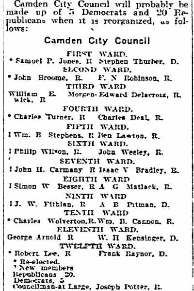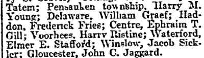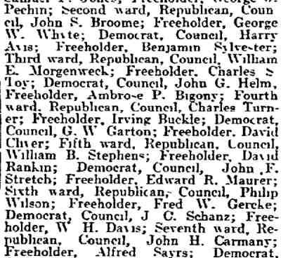 Elks Camden Theatre - Rev. George W. Peck - Linden Baptist Church - Third Regiment Orchestra John H. Carmany - Charles A. Ewing - Robert C. Dugan - Joseph L. Morris Joseph Kolb - Charles Henry Fetters - William Stansbury - Edwin Joseph Holland William J. Thomson - Michael McNulty - Henry C. Loudenslager Edward F. Butler - James W. Chalmers - Fred Whitcomb - Frank Lee Dickinson |