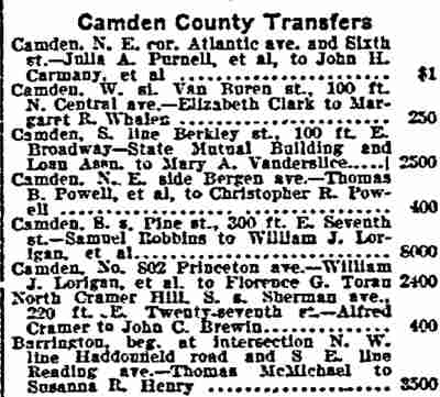 Inquirer October 20, 1902 Atlantic Avenue - South 6th Street Julia A. Purnell - John H. Carmany Van Buren Street - Central Avenue Elizabeth Clark - Margaret R. Whalen Berkley Street - broadway Mary A. Vanderslice Bergen Avenue Thomas B. Powell - Christopher R. Powell Pine Street - South 7th Street Samuel Robbins - William J. Lorigan Princeton Avenue - Florence G. Toram Sherman Avenue - North 27th Street Alfred Cramer - John C. Brewin |