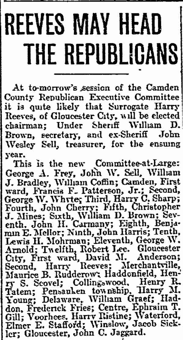 Inquirer December 1, 1902 William D. Brown J. Wesley Sell George A. Frey William J. Bradley WIlliam Coffin Francis Ford Patterson Jr. George W. Whyte Harry C. Sharp John Cherry Christopher J. Mines Jr. John H. Carmany Benjamin E. Mellor John Harris Lewis H. Mohrman George W. Arnold Robert Lee Henry S. Scovel - John C. Jaggard David Anderson - Maurice B. Rudderow Henry R. Tatem - Harry M. Young - William Graef Frederick Fries - Ephraim T. Gill - Harry Ristine Elmer E. Stafford - Jacob Sickler - Harry Reeves |