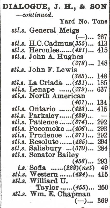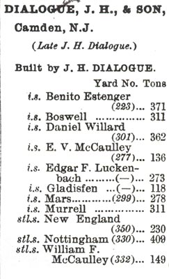 A few years after the partnership's formation, Wood's suicide in April 1874 left Dialogue in sole control of the company, although Wood's widow retained ownership of her husband's portion of the shipyard real estate. Business was further complicated by a serious fire in 1877. If past performance is any measure it may be inferred that Dialogue surmounted the setback with his usual aplomb. The yard's founder apparently decided to concentrate on the building of tugboats rather than larger commercial and military vessels, while the general repair business continued as before. Perhaps Dialogue felt this an ideal niche, preferring to remain on the sidelines as Philadelphia's William Cramp and Chester's John Roach fought for the large vessel orders. Specialization, whether intended or not, bore fruit as the yard's reputation for first-class tugboats spread throughout the industry. Dialogue-built tugs, or "towboats" as they were popularly known (the term "towboat" deriving from their early use in towing sailing vessels and canal boats), did yeoman service in major United States and South American ports. From about 1880 onwards the proportion of iron-hulled versus steel-hulled vessels rapidly reversed with the Dialogue works completing its own conversion to the latter by about 1890. The year 1890 also saw the Dialogue firm included in an area fire insurance survey undertaken by E. Hexamer & Son of Philadelphia. It noted the employment of "500 men and a few boys" in the manufacture of "Ship Building, Engines and Boilers, Machinery in general." By the time of the survey twenty-eight year-old John H. Dialogue, Jr. had become his father's partner after serving apprenticeships in nearly every department of the yard. The firm was now renamed for the last time as John H. Dialogue & Son. The senior Dialogue passed away on October 23, 1898, at age seventy. During his forty-year Camden residence he had served three terms on the board of education, presided over the Camden City Council, and been elected president of the New Jersey Electoral College. His obituary was front-page news in the Camden Daily Courier. Eight foremen of the shipyard's various departments served as his pallbearers. 8 Dialogue's son subsequently assumed proprietorship of the yard and under his supervision fifty-three ships, mostly tugs, were launched. Anxious creditors forced the younger Dialogue into bankruptcy in late 1913. An auctioneer's brochure describing the yard's real estate and equipment ran fifty pages and is a unique record of the variety of tools and machinery that a modern yard required.9 The property's buyer was the Reading Railroad which, through hidden buyers, obtained the real estate for little more than half its appraised value. In short order the yard's buildings were demolished to make way for an extension of the Reading's Camden terminal. The shipbuilding business has traditionally been one of boom and bust cycles, a relatively modest capital return, and an uncertain future. Perhaps these factors, combined with the absence of the man who had begun the enterprise, caused his son to lose the mettle that had carried the yard through its first thirty-eight years.