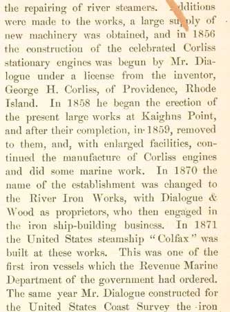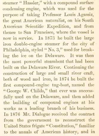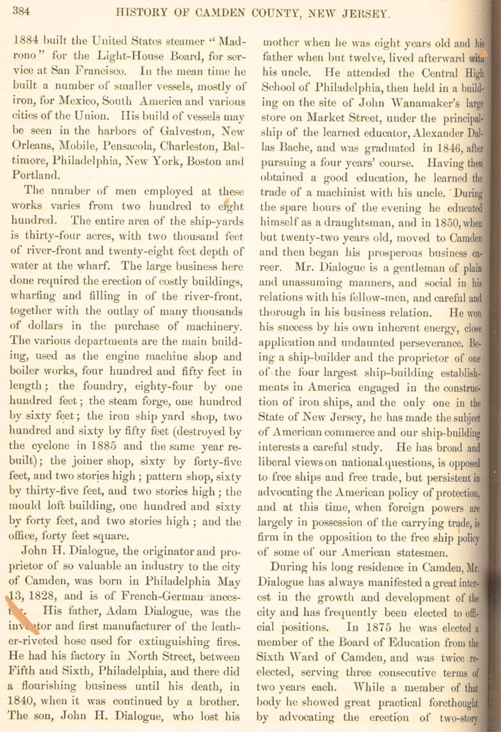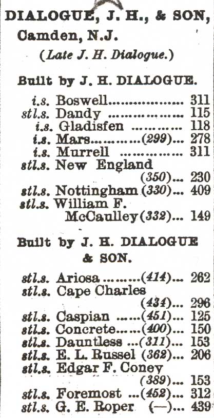 Prominent among the shipbuilding concerns of the United States is that of John H. Dialogue and Son, located at Camden. N.J. John H. Dialogue, the founder of the works, was born in Philadelphia, May 13, 1828, and started a small shop at Second Street and Bridge Avenue, Camden, where he did repair work for the Camden and Amboy Railroad and the Camden and Philadelphia and West Jersey Ferry Companies. The business grew rapidly and when in 1856 Mr. Dialogue commenced the construction of Corliss engines under a special license from the inventor he found larger works necessary, and two years later erected the present large establishment at Kaighn's Point. In 1870 the name of the concern was changed to the River Iron Works, with Dialogue and Wood as proprietors, and the iron shipbuilding business was engaged in with constantly increasing success. During the ensuing twenty-five years every conceivable form of river, coast and ocean-going steamer was built, and several contracts were executed for the government. The vessels built by the firm are to be found in every part of the United States and many foreign countries. The shipyards at Kaighn's Point cover an area of thirty-four acres, with a frontage on the Delaware River of two thousand feet, and a water depth of twenty-eight feet, making an admirable location for the business. The plant, which is equipped with every modern appliance, gives employment, in seasons, of from two hundred to eight hundred men. John H. Dialogue, founder of the firm, after an eventful life, in which he took active part in the civic and political history of his adopted city, died Sunday, October 3, 1898, and the business descended to his son, who had been made a partner in the firm upon the retirement of Mr. Wood, when the title of the firm was changed from the River Iron Works to John H. Dialogue & Son. Mr. Dialogue, Jr., present owner of the works, received a practical education with his father, and since his proprietorship has materially advanced the operations of this large industry. |