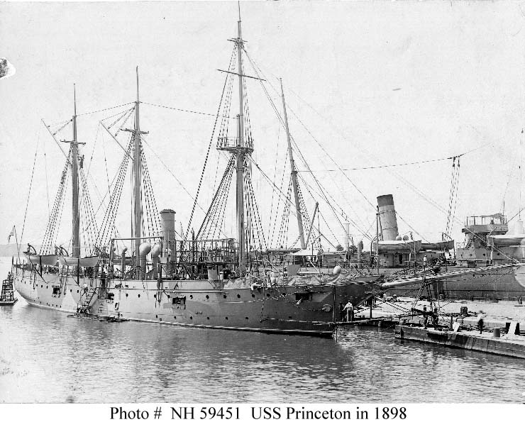 USS PRINCETON PG-13 a 1103-ton Annapolis class gunboat, was built at Camden, New Jersey. Commissioned in May 1898, she briefly served in the Caribbean area during the closing weeks of the Spanish-American War. In 1899, she was transferred to the Pacific, where she spent the rest of her Navy career. Her active service was spent in Asiatic waters, on the U.S. Pacific coast, off Central America and as a station ship at Tutuila, Samoa. Princeton was decommissioned in April 1919 and sold the following November. The third USS Princeton was a composite gunboat in the United States Navy. Princeton, a 1103-ton Annapolis class gunboat, was laid down in May 1896 by J. H. Dialogue and Son, Camden, New Jersey; launched 3 June 1897; sponsored by Miss Margeretta Updike; and commissioned 27 May 1898 at Philadelphia, Pennsylvania, Commander C. H. West in command. After acceptance trials 7–25 July 1898 off Delaware Bay, Princeton got underway for Key West where she joined the North Atlantic Fleet 27 July at the beginning of the Spanish-American War. She was immediately sent (2 August) to patrol the area from the northern tip of the Yucatán Peninsula to Livingston, Guatemala. After completing this mission 13 August, she returned to Key West and the Dry Tortugas and remained on this station until departing 11 January 1899 for New York. Princeton sailed for the Pacific in early 1899 She passed through the Straits of Gibraltar 2 February and the Suez Canal 13–17 February, joining the Asiatic Fleet 16 April at Cavite, Philippines . Princeton cruised throughout the Philippines 4–15 May with Petrel , distributing the proclamation of peace with Spain. Later, she carried Senator Albert J. Beveridge on a tour of the newly acquired Philippine Territory. In late May, Princeton commenced blockading the Lingayen Gulf ports of St. Vincent and Musa and extended the blockade to the entire Gulf 18–26 June. During the various local disturbances on Luzon, she landed troops at San Fabian 2–7 November, transported cavalrymen from Vigan to Lingayen, conveyed dispatches, received surrendered arms and carried stores to the Marines at Subic Bay. Princeton took formal possession of the Babuyan and the Batan Islands 10–13 January 1900 and continued to patrol off Luzon 10 February. Princeton was later station ship at Iloilo and Cebu 5 March-21 June. At the time of the Boxer Rebellion, Princeton cruised in Chinese waters (26 June–29 November) between Hong Kong and Woosung where she received a draft of men from Buffalo on 9 August. She returned 4 December to operations in the Philippine-American War, principally in the Sulu Archipelago, and remained on duty there until 20 July 1902. Princeton was stationed at Cavite beginning 23 July and called at Uraga, Japan (9 October–18 December). While at Cavite, she participated in large-scale maneuvers off the Philippines (29 December–3 February 1903). Afterwards, Princeton acted as a survey ship. (13 February–5 April) at Malabug Bay, Zamboanga and Dumanquilas Bay until she departed 13 April for California. Princeton decommissioned 12 June 1903 at Mare Island Navy Yard. Princeton recommissioned 12 May 1905 at Mare Island Navy Yard and was attached to the Pacific Squadron. She left 4 June for duty as station ship at Panama City, where she remained until 24 October. On 2 December 1905, Princeton returned to Mare Island Navy Yard and began cruising off the Pacific coast from San Diego, California to Esquimalt, British Columbia. She escorted Rear Admiral C. J. Train’s remains from Vancouver to Seattle (22–24 August), assisted Boston (6–9 December) which was aground off Bellingham, Washington, and accompanied California 10–22 September on her sea trials off Washington. Princeton remained on station off the West coast until directed to rejoin the Pacific Squadron 3 January 1907 at Magdalena Bay, Mexico. Princeton proceeded to Corinto, Nicaragua, arriving 17 March for the purpose of protecting American interests there. She transported troops from Ampala, Honduras, to La Unión, (12 April) and brought General Bonilla back to Salina Cruz, Mexico (13 April). She returned to San Diego 30 May and decommissioned 3 July 1907 at Bremerton, Wash. Princeton recommissioned 5 November 1909 at Bremerton and sailed 28 November for Central America for duty with the Nicaraguan Expeditionary Squadron. From 20 December until 21 March 1911 she showed the flag in this area, operating between San Juan del Sur, Nicaragua, and La Unión, El Salvador. She returned to Puget Sound Navy Yard 20 June 1911 for repairs and alterations. From late 1911 until 1915 she was used as a station ship at Tutuila, American Samoa. Returning to San Francisco 18 September 1915, Princeton decommissioned and was laid up until 20 February 1917 when she proceeded to Puget Sound for repairs. She commissioned in ordinary there 16 January 1918 for use as a training ship at Seattle from 9 May 1918 to 25 April 1919 when she decommissioned. Princeton was struck from the Navy List 23 June 1919 and sold to Farrell, Kane and Stratton, Seattle, Washington, 13 November 1919. |