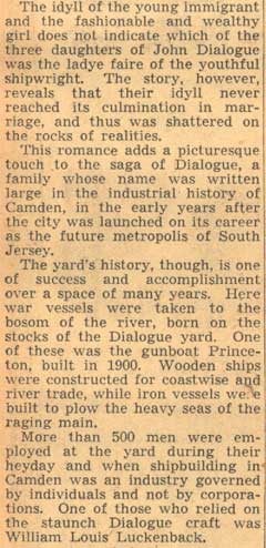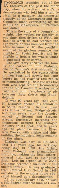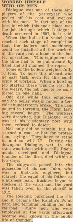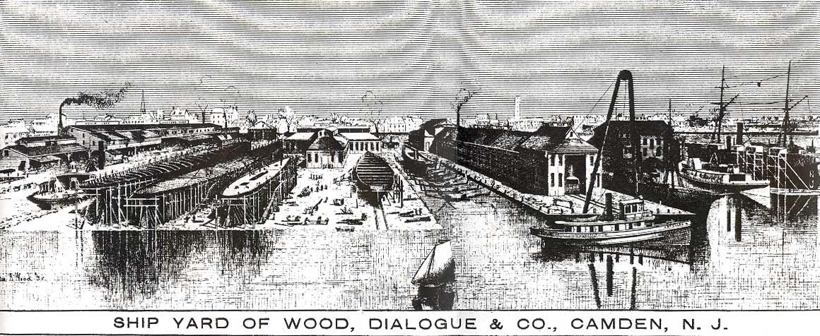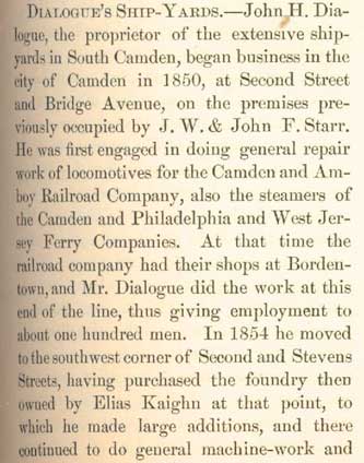 If the measures of success are how long the items of one's manufacture remain in use, and how far around the world they have traveled, John Dialogue surely should be one of Camden's more recognizable names. In truth, in his time and for many years thereafter he was. Born in Philadelphia in 1828 to Adam and Sallie Dialogue, John Dialogue founded a successful shipbuilding business in Camden. It was at one time on of the four largest shipyards in America. There are tugboats produced in his yards that remain in use today, over 100 years after his passing. He also produced patrol craft for the United States Navy. John Dialogue deeply involved himself in the civic affairs of the city, and devoted much time to education. He served two terms on the Board of education, and was greatly responsible for the erection of the richard fetters, Isaac S. Mulford School, and John W. Mickle schools in the 1870s. He also served on City Council, was its president at one time, and was elected as a Democrat to the State Senate from Camden, which was heavily Republican at the time. He also served as president of the Electoral College delegation from New Jersey. In 1850 he married Mary Easby in Philadelphia, and subsequently moved to Camden. There were four children, son John Dialogue Jr., and daughters Adelaide, Stella, and Lillie. Mrs. Mary Dialogue passed away in 1882. John Dialogue's first business in Camden was repairing locomotives for the Camden & Amboy Railroad, at South 2nd Street & Bridge Avenue, and also repaired ferry boats. In 1854 bought the Elias Kaighn foundry at South 2nd and Stevens Street, where he did general machine work and built Corliss stationary engines. In 1858 he moved his operation to Kaighn’s Point, where he eventually built a large shipyard. In 1862 with several partners John H. Dialogue founded the National Iron Armor and Shipbuilding Company in Camden. The first vessel built was the propellor-driven Lookout, of 25 tons, for W.P. Clyde. This business, however, closed before the Civil War ended. John H. Dialogue then worked as a subcontractor for the A. & W. Desmond firm at Baltimore, Maryland, in the construction of the monitor USS Waxsaw. The business was renamed in 1870 as the River Iron Works, Dialogue & Wood, proprietors. It was then that he started building iron ships. The first ship the new firm produced was the 48 ton propellor driven Frank G. Fowler. John Dialogue came into full control of the firm after the death of Mr. Wood. The Dialogue shipyard was one of the first to adopt the compound marine engine and Scotch boiler. Best remembered for the many tugboats they produced, the Dialogue works built many noted vessels for private interests and for the United States government. In the 1880s the yard produced a ship for the Lighthouse Board that was the first stem vessel having two sternpost and two rudder-posts and was used at Galveston, Texas. The Dialogue was also involved in the restoration of the USS Constitution in the 1870s. The shipyard had 34 acres, 2000 feet of waterfront, and employed from 200 to 800 men. John H. Dialogue passed away on Sunday, October 23, 1898 . His son, John H. Dialogue Jr., ran the operation for several years, before being forced out of business shortly before the outbreak of World War I. Below you will find the biography of John Dialogue published in George Reeser Prowell's History of Camden County, his 1898 obituary, a 1908 article from a book about the history of Philadelphia, a June 1939 article about him by Camden Courier-Post columnist Gordon Mackay, and much more recent article by Kenneth Kogan. There are also pictures and information about Dialogue produced ships. |