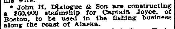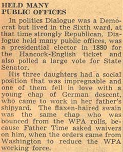 The funeral of John B. Dialogue Sr.. the widely known shipbuilder, was largely a ttended by prominent citizens and officials from his late residence at Broadway and Pine Streets. Services were in charge of Rev. Gilbert Underhill, rector of St. John’s P.E. Church. The eight foreman of the different departments at the shipyard acted as pallbearers. Interment was private at Evergreen Cemetery. |