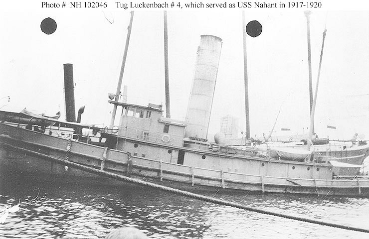 The USS Nahant SP-1250 , a harbor tug built in 1913 by the Dialogue shipyard as Luckenback No. 4 was acquired by the Navy from Luckenback Steamship Co., Inc., New York City 1 December 1917 and commissioned 12 December 1917. Operating in the 3rd Naval District and armed with a 3" gun and two machine guns, Nahant performed towing tasks in New York Harbor during her Naval career. Decommissioning early in 1920, Nahant was transferred to the City of New York and served the Police Department as Service No. 2 and as John F. Harlan . Returned to the Navy in 1928, Nahant was struck from the Naval Register 27 September 1928 and sold to Joseph O'Boyle of New York 24 December 1928. Her fate is unknown. |