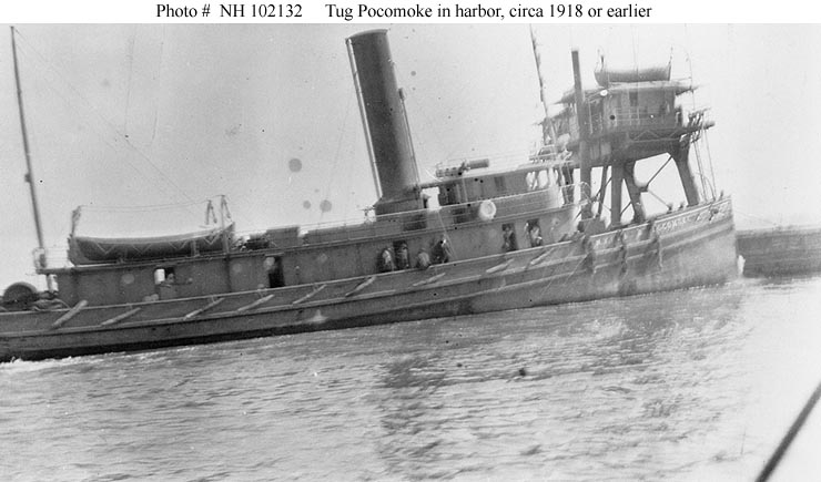 Pocomoke , a 293 gross ton steam tug, was built at Camden, New Jersey, in 1906. She subsequently was owned and operated by the New York, Philadelphia & Norfolk Railroad Company. In 1918, as part of the World War I ship acquisition effort, Pocomoke was evaluated by the Navy and assigned the identification number 2265. However, she remained in civilian hands and had no Naval service. |