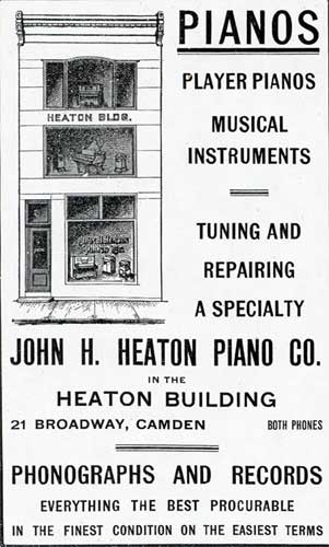 JOHN H. HEATON was born around 1878 to Clayton C. and Anna Heaton. His parents had married in Camden County in 1864, and by 1870 had moved to the Cinnaminson and Palmyra area in neighboring Burlington County. Clayton C. Heaton supported his family which included three children older than John in a variety of jobs. The family was living in Cinnaminson in 1870, Clayton Heaton then employed as a store clerk, and in Palmyra in 1880, when he was working as a farm laborer. In the mid 1880s Clayton Heaton, having found work as a salesman in Philadelphia, brought his family to Camden. The 1887-1888 City Directory shows the Heatons at 69 State Street, which later became Kelly's Bar before being razed in the 1970s. The family relocated to 319 North Front Street in 1888, and was there as late as 1891. John Heaton grew up and followed a career in sales. He married at the age of 18. Already a prominent businessman by 1912, he was a charter member of the Rotary Club of Camden. His business, the John H. Heaton Piano Company, was then located at 21 Broadway. At the time of the 1920 Census, John Heaton, with his wife Eda owned a home at 423 North 4th Street, between Cole and Pearl Streets. The John Heaton family also included a 10 year old daughter, named Eda after her mother. By this time John H. Heaton had moved his piano business to 528 Market Street in Camden. In the early 1920s James J. Scott purchased two pianos from John H. Heaton for use at the new Walt Whitman Hotel, at Broadway and Cooper Street. The property at 528 Market Street was one of many acquired by the City of Camden in the very late 1920s for the site of the new City Hall. By April of 1930 John H. Heaton and family had moved to Moorestown NJ, where they bought a home at 112 Colonial Ridge, the corner of Camden Avenue and Colonial Ridge, where he was still living as late as 1936. As the 1936 New Jersey Bell Telephone Directory, however, has no listing for the piano business in Camden, it appears that he moved his business Moorestown. |