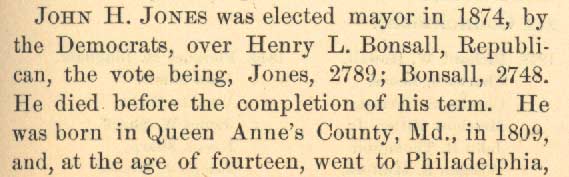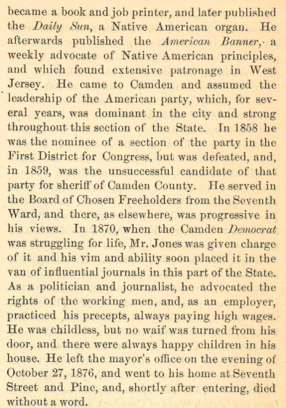 JOHN H. JONES was born in Queen Anne's County MD in 1809, and moved to Philadelphia at the age of 14, where he learned printing. He went into business for himself, and got into the business of publishing newspapers. His papers supported anti-immigration "Native American" principles, and were very popular in the Camden area. He moved to Camden and became the leader of the American Party. John Jones was an unsuccessful candidate for Congress in 1858, and for Camden County Sheriff in 1859. He served as a freeholder from Camden's Seventh Ward. In 1870 he took control of the Camden Democrat , and revived the fortunes of that newspaper. After defeating Henry H. Bonsall in the mayoral elections of 1874, John H. Jones succeeded Samuel Gaul as mayor. John H. Jones died before the completion of his term, on October 27, 1876. He was succeeded by John Morgan. During the mayoral term of John H. Jones, Camden's second City Hall was completed, Cooper Hospital was incorporated on March 24, 1875, under the name of Camden Hospital, and Camden took part in the Centennial celebration of 1876. |