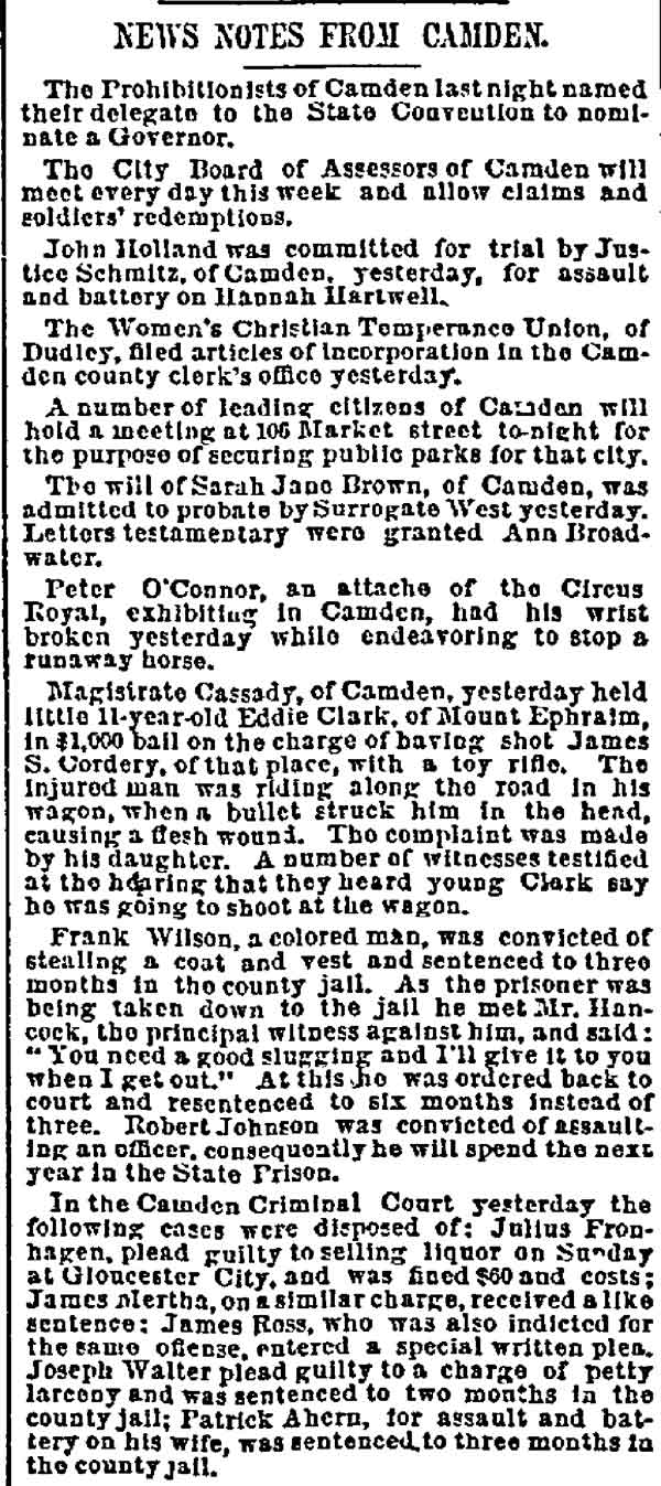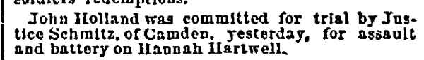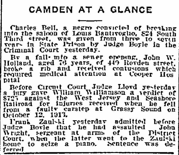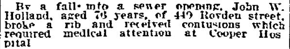John Holland married during the 1860s. When the Census was taken he was living in the Middle Ward of Camden with his wife, Mary and two children, George and Ella. He was then working at the local railroad depot. John Holland was appointed to the Camden Fire Department as an extra man with Engine Company 2 on April 8, 1877. He was living at 423 Senate Street and was still in the employ of the railroad, as a driller. He was working as a flagman by the time the census was taken in 1880. At that time there were three children at home, Ella, 17; William, 10; and John W. Holland Jr., 5. The family was still living at 423 Senate Street and John Holland was working for the Pennsylvania railroad as a switch tender when he left the Fire Department in the spring of 1882. The Hollands stayed at 423 Senate Street through at least the beginning of 1888. Sadly, Mary Holland passed during the 1880s. John Holland remarried around 1890. City Directories from 1890 through 1894 John W. Holland is recorded living at 420 Evans Street. The Hollands had moved to 442 Berkley Street by 1896. The 1897 City Directory shows John and Rebecca Holland at 531 West Street. The 1900 Census lists John W. Holland working as a railroad switchman, living at 531 West Street with his second wife, Rebecca and his 19 year-old stepson, August Gethner. Apparently again a widower, John W. Holland had moved to 448 Royden Street by 1906, living with his son William Holland. When the Census was taken in 1910, John W. Holland was living at 452 Royden Street, the home of his son William Holland, his wife Harriet, and her son from a previous marriage, Nathan Petit. John W. Holland was no longer working at this time. He was still living with his son when the 1914 City Directory was compiled. The Hollands had moved to 449 Royden Street by April of 1915 and to 416 Royden Street by the middle of 1918. When the Census was taken on January 13, 1920 John W. Holland was not listed at his son William's home at 416 Royden Street. William and Harriet Holland and stepson Nathan Petit, by this time a Camden police officer, were living at the Royden Street address. It would appear that John W. Holland had passed away in late 1918 or in 1919. |