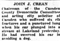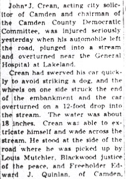 AIDES HELD SEEKING CITY RULE David Baird Jr., and his allies have already arranged their slate for the next city commission election and are laying plans to recapture the city government of Camden. Democrats should know of this movement and prepare to thwart the proposed plans at once. This warning was given by County Prosecutor Samuel P. Orlando last night, at a testimonial dinner in the Hof Brau at which three Ninth Ward Democrats were feted, and at which 500 were present. The trio honored comprised Mrs. Mary Ellen Soistmann, state committee woman; Oscar Moore, freeholder, and John J. Crean, assistant city solicitor and county committeeman. While the three guests were feted and presented with wrist watches and other tokens, the affair took on a love feast aspect for the three New Deal commissioners arid all shades and leanings of Democratic leadership. Mayor George E. Brunner was toastmaster and took occasion to poke fun at the G.O.P. and its tribulations over the county headquarters. Brunner Jests at G.O.P. "I have just received word," said the Mayor with due solemnity, "that the Republican county committee of whom I, read today was having trouble over their headquarters, have finally solved their troubles tonight.” "I understand they are giving up their present location and. have just been presented by the Bell Telephone Company with a booth, and are now looking for another tenant to whom the committee can sublet half the space." Orlando's warning came after he congratulated the special guests, He said: "I have every reason to believe that Dave Baird and the rest of the Republican chieftains are already laying their plans to capture the city commission. They are working to the end with their own slate, so that they can take from the people of Camden the good government which they have received far some time. "We Democrats do not want to take this warning lightly, we want to remember that Baird and his chieftains are already working toward capturing the government of Camden, and this is something that .we want to prevent at all hazards." Orlando also congratulated the gathering as an indication of the growth of the party, and the faith that the people of Camden come to have in the Democratic party and in its principles." The prosecutor also prophesied greater honors in the future for the triumvirate who were the guests of the occasion. Disclaims Harmony Rift Mrs. Emma E. Hyland, postmaster and long a figure in Ninth Ward affairs declared she resented any newspaper stories that hinted that there was the slightest rift in the Democratic party. She told of the trouble the Democrats in the Ninth Ward, which, she declared, had never elected a Democratic freeholder until Oscar Moore was chosen. Mrs. Hyland told of detectives shadowing her home during election, and of 'the struggles' that she and Moore had known together in fighting for the party in that bailiwick. "I want to say" continued the postmaster, "that we must all be impressed by the spirit of harmony that this gathering means has come to pass. "I don't want you, and I will not myself believe all you read in the newspapers declaring we are fighting among· ourselves, for if there is anything like that in progress, I don't know anything about it and I don't believe you do, either." County Treasurer Edward J. Kelleher, hailed as "The Father of the Democratic Party in Camden County" contrasted the spectacle before him with the harmony dinner which he and others sponsored years ago. “We sold 150 tickets," he said, "and gave away 150 more, and when the sponsors reached the hall at 7 p.m., the hour of the dinner, there wasn't a single other person on hand. Later the hall was filled, and it held 200 guests. 200 to attend a Democratic harmony dinner that embraced all of Camden county." Officials Laud Guests Mrs. Bertha Shippen Irving, postmaster of Haddonfield; Police Judge Gene R. Mariano and others also congratulated the guests. Mayor Brunner introduced Commissioner Frank J. Hartmann by calling attention to the cleanup campaign now under Hartmann auspices. "Just as Hartmann is making Camden a cleaner city in which to live," said the Mayor, "so has Commissioner Kobus made the city clean from crime. The streets are clean, the city is clean, and this has only been made possible by the efforts of the three commissioners who have worked in harmony, and who are going to continue to work in harmony." Crean, moore and Mrs. Soistmann spoke their thanks to those present for the banquet, the gifts and the sentiments expressed. |