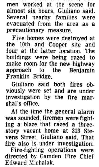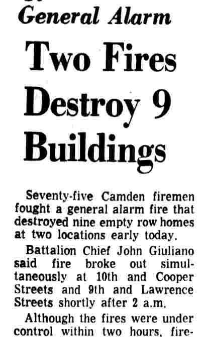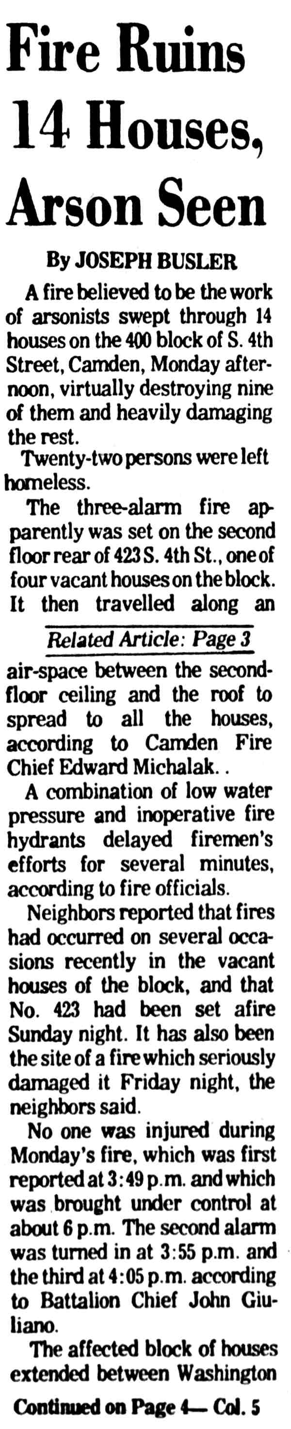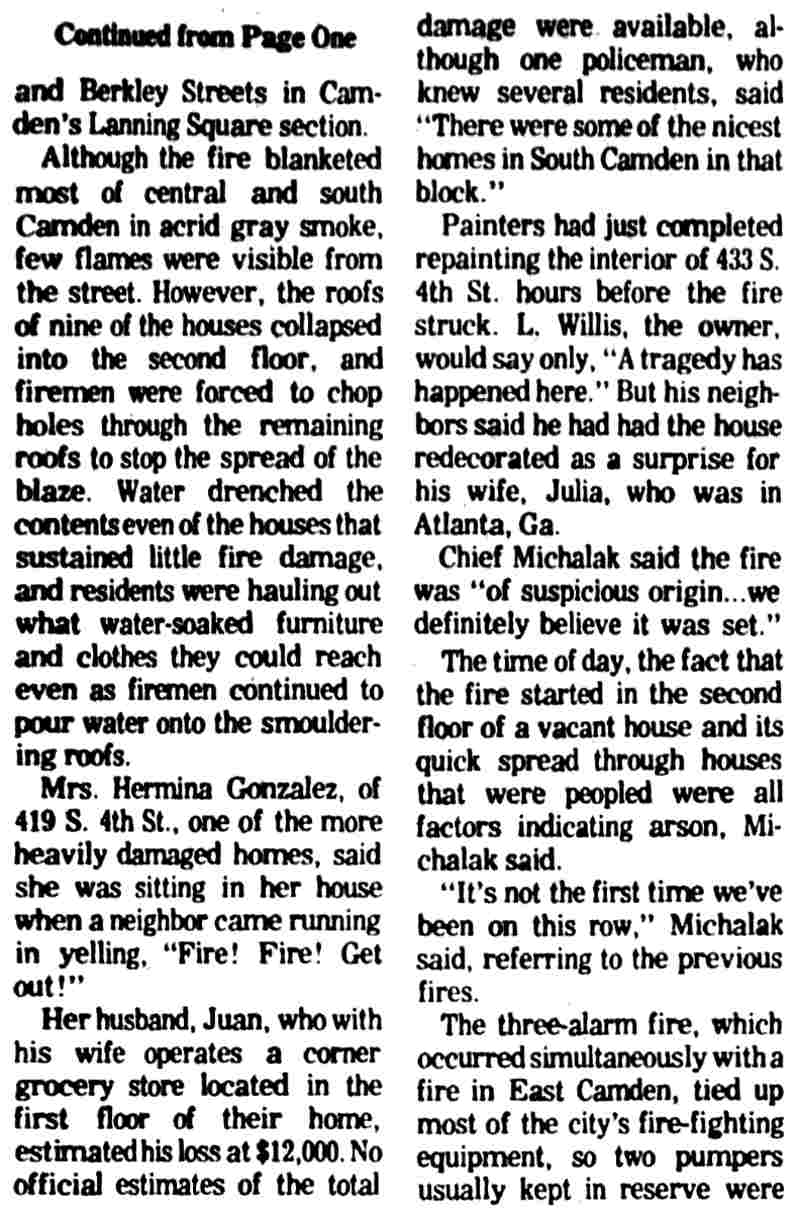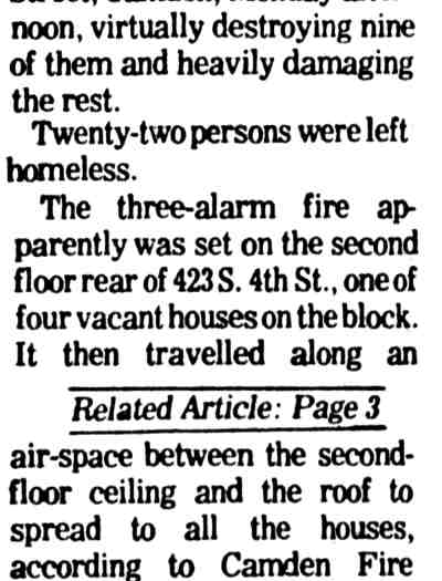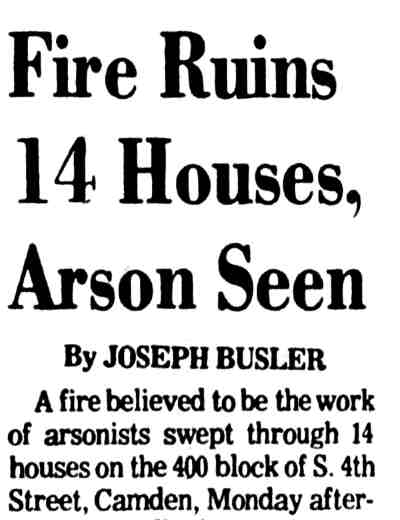 THREE-ALARM fire believed set by arsonists sweeps through the 400 block of South 4th Street in Camden Monday, destroying fourteen houses. |