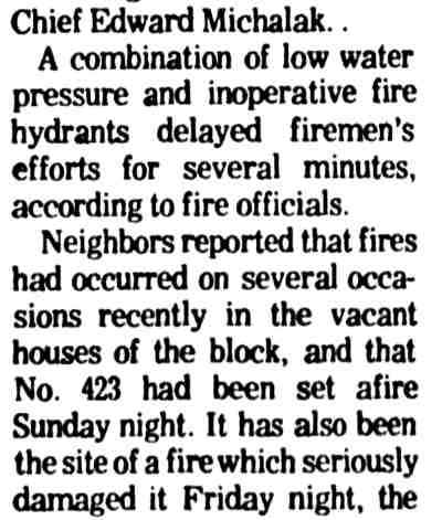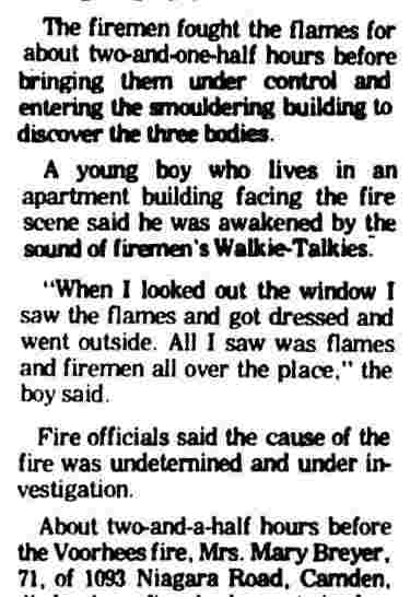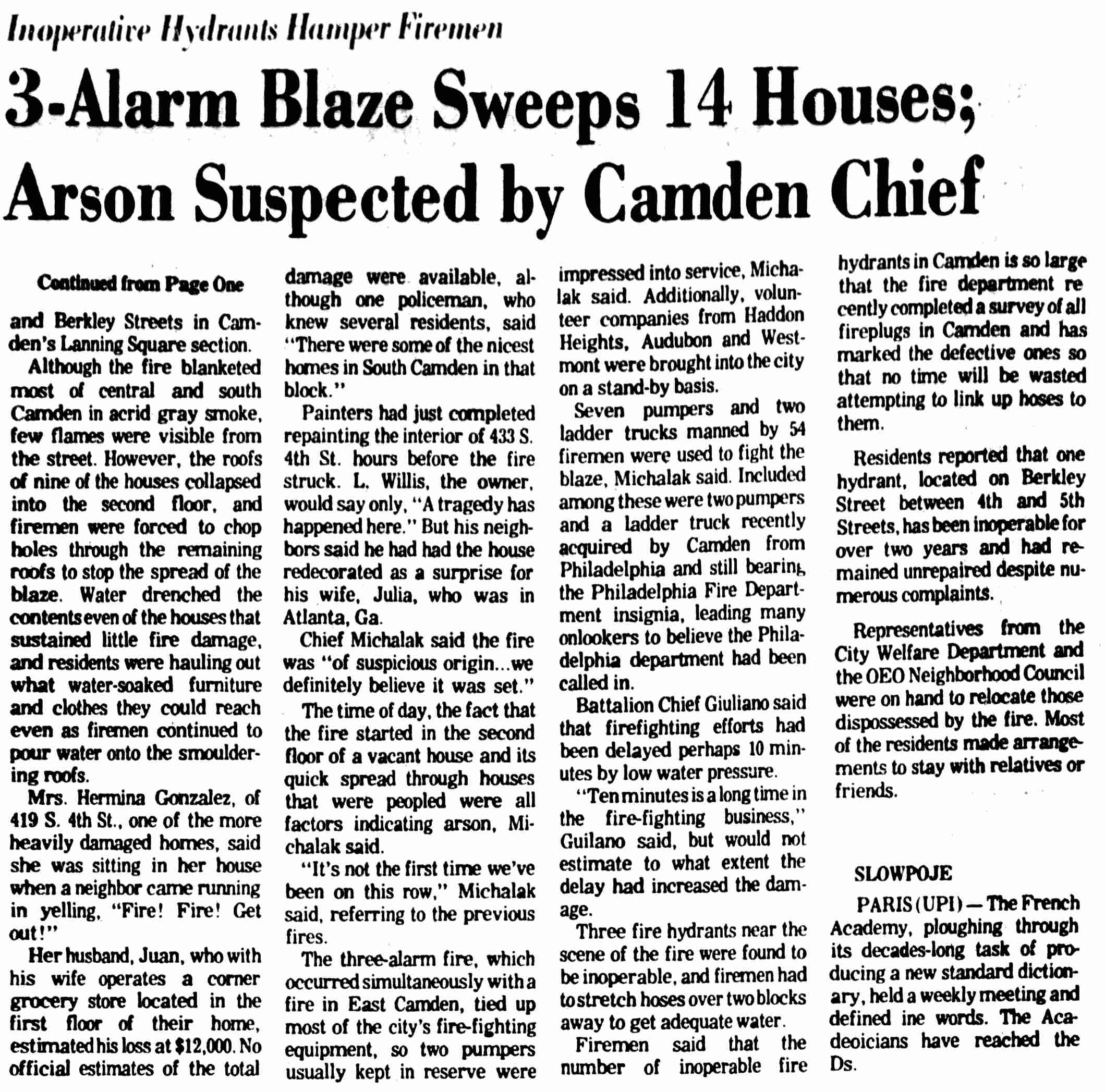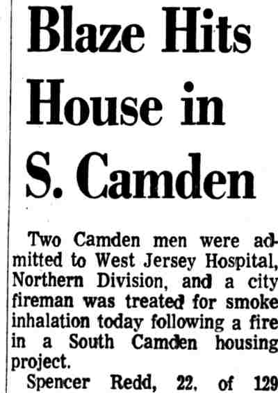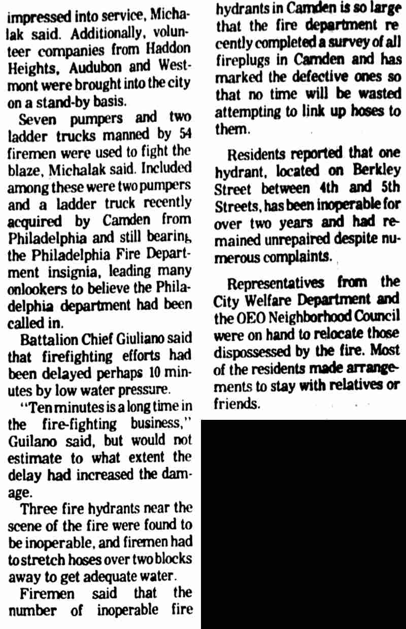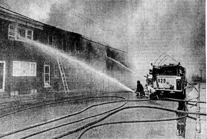 THREE-ALARM fire believed set by arsonists sweeps through the 400 block of South 4th Street in Camden Monday, destroying fourteen houses. |