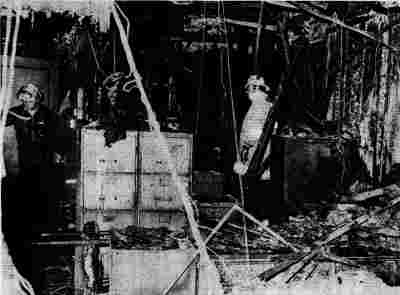 Street Left: A firefighter hoses down smoldering ruins of the warehouse in Camden.