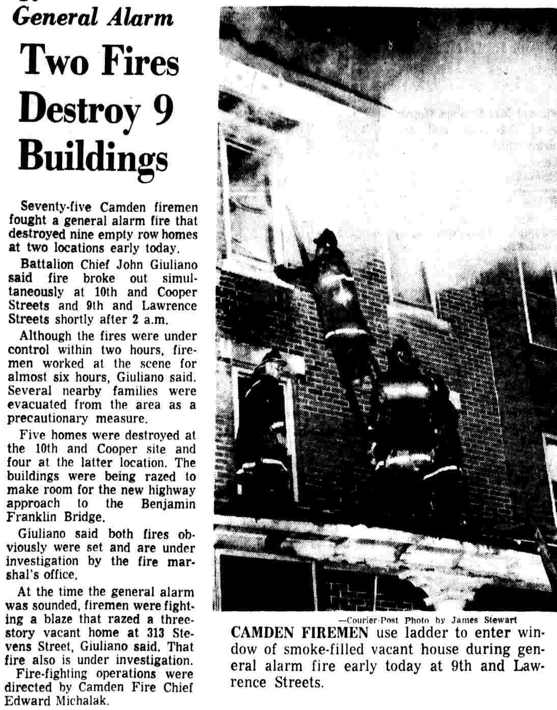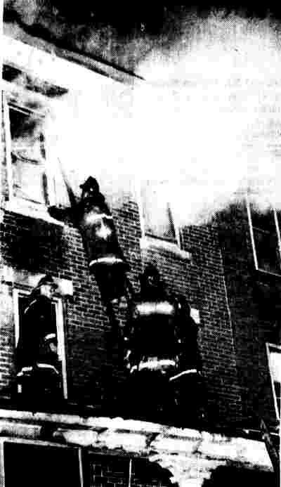 CAMDEN FIREMEN use ladder to enter window of smoke-filled vacant house