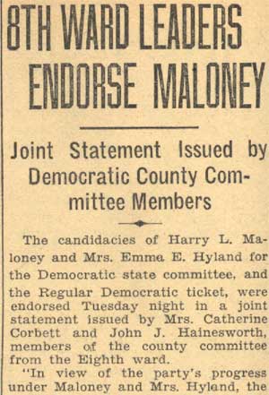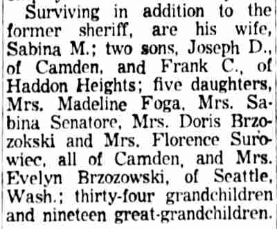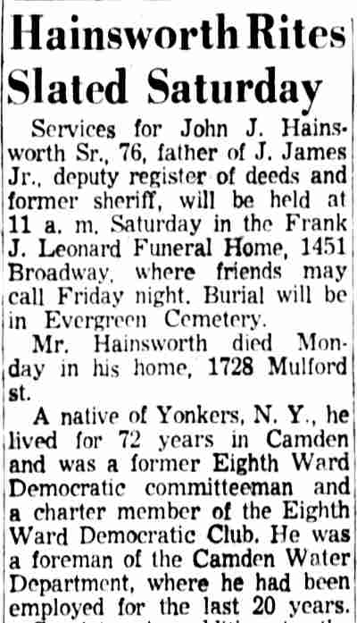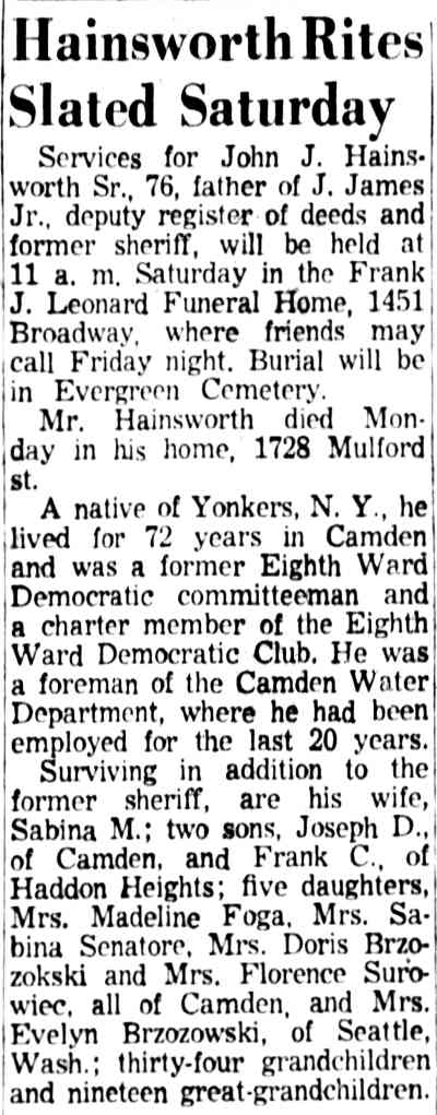 JOHN JAMES HAINSWORTH SR. was born in New York in 1881. By 1920 he had moved to Camden NJ, where he lived at 1009 Ferry Avenue, the corner of Ferry Avenue and Mulford Street, with his wife Sabina and eight children. More children came along, and by 1930 there were thirteen children at home and son John J. Jr., who had moved out to start his own family. John J. Hainsworth served as the Democratic County committeeman from Camden's Eighth Ward in the early 1930s, and supported Emma Hyland and Harry Maloney over Edward J. Kelleher for control of the county organization. By 1947 John J. and Sabina Hainsworth had moved to 1728 Mulford Street. Their former home was, and still is in 2004, the home of the Progressive Democratic Club of the Eighth Ward. John J. Hainsworth passed away on March 31, 1958, survived by his wife. Sabina Hainsworth remained a Camden resident until her passing in July of 1976. Son John James "Big Jim" Hainsworth Jr. was also politically active, and served as Camden County sheriff and as Deputy Register of Deeds. Grandson Joseph C. Hainsworth served for 31 years with the Camden Polcie Department. Grandson, John J. "Jim" Hainsworth III, was also active in Camden city and county politics. Another grandson, James R. Asher, served for over 29 years with the Camden Fire Department, retiring as District Chief in 1976. |
