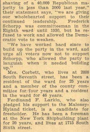 A birthday party was held Tuesday night in honor of Mrs. Anna Olsen, of 1811 Broadway, by the Eighth Ward Roosevelt Democratic Club auxiliary at 521 Ferry avenue. Talks were given by Mrs. Katherine Corbett, president; Edmund H. Olsen, husband of Mrs. Olsen; Custer Brelsford, John J. Hainsworth and Mrs. Olsen. Among those who attended the party were Mrs. Elmira Schoeneman, Mrs. Mary Gifford, Mrs. J. Hainsworth, Mrs. Sarah Higgins, Mrs. Rose Mascio, Miss Emily Olsen, Miss Edna Olsen, Mrs. Katherine Kurtz, Mrs. Etta Smith, Mrs. Emma Percival, Mrs. Margaret Finelli, Mrs. Beryl Hoffbauer, Mrs. Stella Lochinic, Miss Dolly Higgins, Miss Rose Pierce, Mrs. Geraldine Olsen, Mrs. Grace Maise, Mrs. Margaret McLoughlin, Mrs. Margaret Lloyd, Mrs. Barrett, Mrs. Mildred Titus, James Hainsworth, Joseph Ballinghoff and John Mascio. |