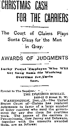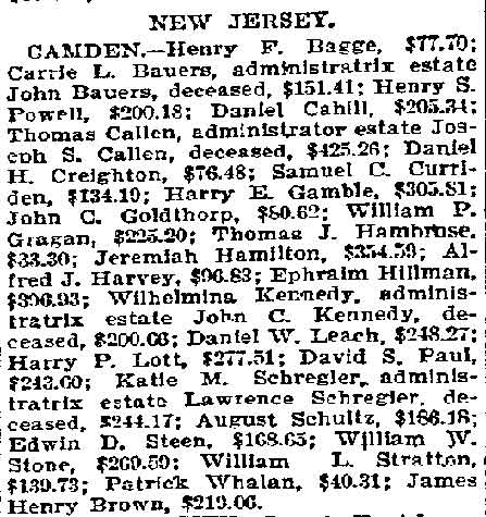 JOHN C. KENNEDY was appointed to the Camden Fire Department on April 8, 1876 as stoker with Engine Company 1, replacing Thomas McLaughlin who had been promoted to Extra Engineer. John Kennedy served for one year. He was replaced by George S. Hunt on April 8, 1877. John Kennedy was one of the many new firemen brought into the department when Claudius Bradshaw was elected Chief. Bradshaw was Chief for just three years, and most of the men he brought into the department only served a year or two. John Kennedy was working as an iron moulder and living on Chestnut Street when he was appointed to the Fire Department. City Directories from 1878 through 1885 show him living at 716 Mount Vernon Street, and the 1880 Census shows him married, and that his wife's name was Wilhelmina. At the time of the Census they were childless. The Kennedys had moved to 755 Walnut Street when the 1887-1888 City Directory was compiled, and John C. Kennedy had secured a position as a letter carrier, which he kept through at least the middle of 1890. The 1894 City Directory shows that he had gone back to work as an iron moulder. Sadly, John Kennedy was dead by the time the 1896 Camden City Directory was being compiled. His widow had moved to 1014 South 8th Street, where she operated a candy and cigar store for several years. In December of 1896 Wilhelmina Kennedy was awarded $200.00 as part of a settlement of a suit John Kennedy and hundreds of letter carriers across the country had brought against the government for payment for working overtime. |