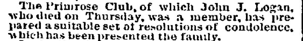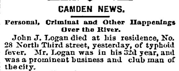 JOHN LOGAN was born in New Jersey around 1856 to Thomas and Mary Logan, both of whom had been born in Ireland. The family, which included a daughter, Elizabeth, was living in Camden's North Ward at the time of the 1860 Census. The Logans were still in the North Ward when the 1870 Census was taken. At that time the family consisted of Thomas and Mary Logan and children Bridget, Rosa, John, and Owen. Three more children came during the 1870s, Thomas, William, and Anna Logan. The 1880 Census shows the Logan family at 513 Bridge Avenue. John J. Logan had already gone into business for himself selling produce.
