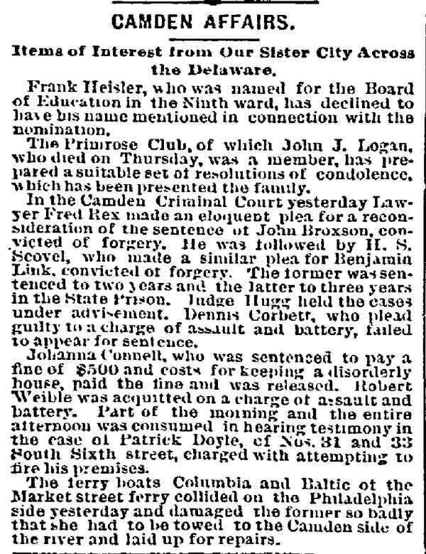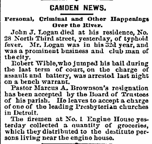 On April 5, 1882 John J. Logan was appointed to the Camden Fire Department to serve as an extra man with the Hook & Ladder Company, replacing Josiah Davis. John J. Logan served with the Fire Department for one year, then was replaced by Peter Gray. John J. Logan was still living at 513 Bridge Avenue when the 1884-1885 Camden City Directory was compiled. The Directory states that he was selling produce at two locations, 505 Market Street and 407 Federal Street. The 1885 Directory shows his businesses at 505 Market Street and at the West Jersey Market. The 1887-1888 City Directory gives an address of 563 Mickle Street. By this time he in businesses selling "meats and provisions" at 505 Market Street and at the "NW corner 4th & Market". The 1888-1889 City Directory shows that John J. Logan had moved to 28 North 3rd Street. His businesses were at the same location. John J. Logan died of typhoid fever in February 7, 1889. When the 1890 City Directory was compiled, Mary R. Logan was living at 28 North 3rd Street and was running the business at Fourth and Market Streets. John J. Logan's brothers Thomas and William remained in business at 505 Market Street as T.F. & W.J. Logan. |