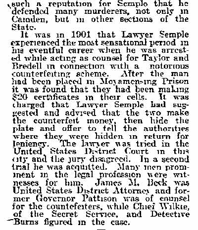 Philadelphia , Nov. 27. After deliberating for nearly 30 hours , the Jury in the case of John L. Semple , the Camden lawyer who was tried in the United States district court here, charged with aiding and abetting counterfeiters , was unable to agree and was discharged by Judge McPherson. |