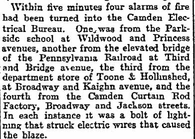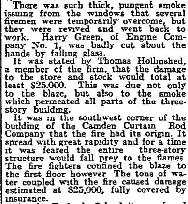 Howard Robbins North 10th Street - Penn Street - Cooper Hospital Wildwood Avenue - Princess Avenue - Broadway Kaighn Avenue - Jackson Street South 3rd Street - Bridge Avenue Toone & Hollinshed - Camden Curtain Rod John McTaggart - harry green Chemical Company No. 1 (Engine Co. 9) Engine Company No. 1 Toone & Hollinshed Parkside School Click on Images to Download |