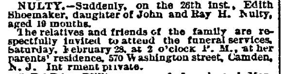 John McNulty was baptized at the Trinity Methodist Episcopal Church in Mullica Hill (Harrison Township), New Jersey on February 10, 1868. He maintained contact with his biological family during the summers, and his mother and brother Michael later moved to Camden. John, however, lived with Joseph E. Roberts family until his marriage in 1888. By 1874 he had anglicized his name from McNulty to Nulty. The Roberts family first appear in Camden City Directories in 1872. Apparently under the direction of Joseph E. Roberts, with Jacob and brother Frank also being involved, the family engaged in real estate and homebuilding in Camden. By 1872 a street, known to this day as Roberts Street, which had not existed when the 1870 Camden City Directory, had been laid out, running from Pine Street north across Royden and Clinton Streets before ending at Clarion Alley. Jacob Roberts made his home at 614 Royden Street, the corner of Royden and Roberts Street, until his death in 1879. By 1874 the Roberts family owned 58 houses in what was then Camden's Fourth Ward. The 1874 City Directory shows Joseph E. Roberts in the insurance business at 419 Hamilton Street, which was renamed Berkley Street a few years later. The 1876 City Directory shows Joseph E. Roberts back in construction at 232 Benson Street, along with his ward John Nulty. Four houses were built at 401-403-405-407 Broadway in 1877. Joseph E. Roberts most likely was the builder. He made his home at 401 Broadway from the time it was built until his death in 1915. John Nulty began working in sales in the 1870s, and his work would center on that of a produce commission merchant. In the mid-1880s he had his own firm, John Nulty & Company, at 324 Front Street, in Philadelphia. He later went into partnership with a man named McMahan, which he was still a apart of when he passed away. John Nulty married Rachel Holston Curry, a school teacher at the Liberty School at 740 Spruce Street, on June 7, 1888 at the Broadway Methodist Episcopal Church in Camden. They lived at a home that they owned at 570 Washington Street. Their were four children, Edith Shoemaker Nulty (1889-1891), Miriam Nulty (1894-1988), Russell Hewitt Nulty (1892-1942) and Alice Barr Nulty (1897-1949). The Nultys friends included Mr. and Mrs. Levi Farnham, Mr. & Mrs. Frank Mulford, Mrs. and Mrs. William C. Riggs. These four familiues and two other, the Taylors and Richie (or Ritchie) family, took shared-expense vacations over a six-week period every summer during the late 1890s and early 1900s. John