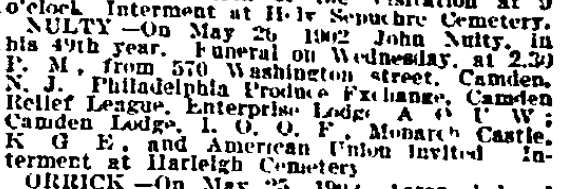Nulty died on May 26, 1902 at age 48 and and was buried in Harleigh Cemetery. He was a