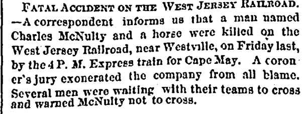 struck by a West Jersey Railroad train near Westville, New Jersey. |