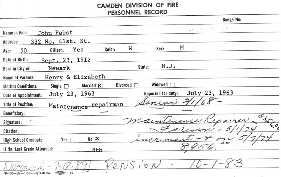 The son of Henry and Elizabeth Pabst, he was born and grew up in Newark, New Jersey. He did not appear in Camden City Directories in the 1940s, and did not appear in New Jersey Bell Telephone Directories in 1956 or 1959, however, he was living in Camden when appointed to the Fire Department on July 23, 1963.