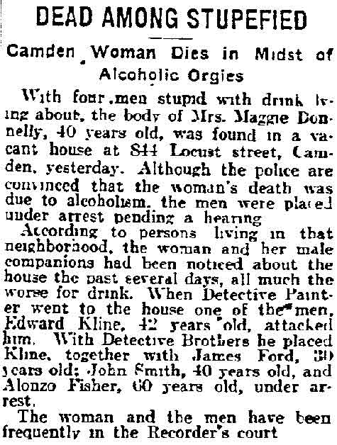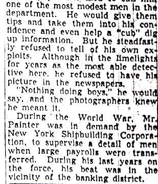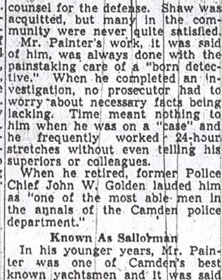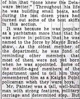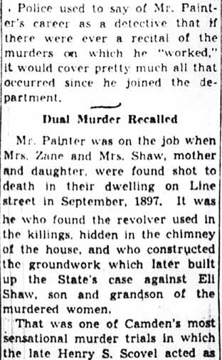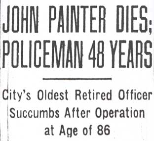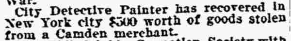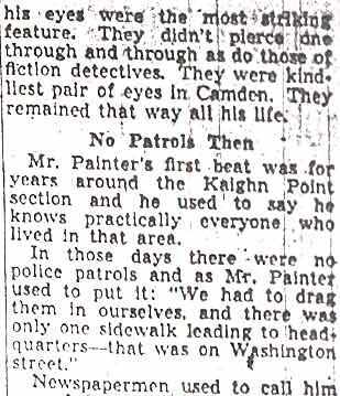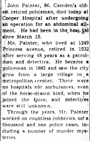 JOHN PAINTER was born in December of 1856 to John and Lucy Painter. His father was a ship carpenter. The 1880 Census shows the family living at 824 South 2nd Street in Camden, New Jersey. John Painter was then working at a box factory. He remained at this address through early 1884. By 1885 he had moved to 329 Walnut Street, and had married. John Painter was appointed to the Camden Police Department in 1884 and served for 48 years, retiring as a detective in 1932. When he was appointed he was one of only 40 patrolmen in the city. John Painter married at the age of 28, around the same time that he was appointed to the police force. The Painters lived at 348 Cherry Street as early as 1887 through at least 1894. By 1900 he had been promoted to detective. The Census shows him living with his wife Jennie, son John and daughter Catherine at 944 South 4th Street. Future Mayor Joseph Nowrey lived across the street at 939, and shoe merchant Henry Kobus was at 943 South 4th Street. The 1910 Census shows the Painter family living at 941 South 4th Street. By 1920 Jennie Painter had passed away. John Painter then lived at 1249 Princess Avenue in Camden's Parkside neighborhood. He made this his home until his death in April of 1940 at the age of 86, after a brief illness. His daughter Catherine lived with him in the late 1920s and early 1930s. |