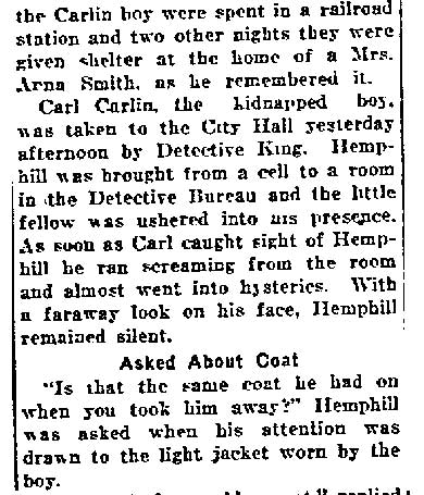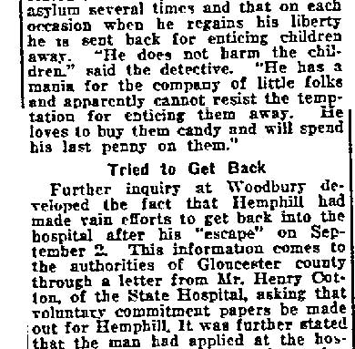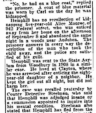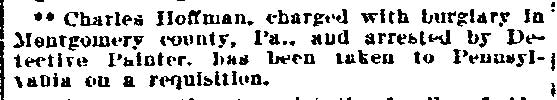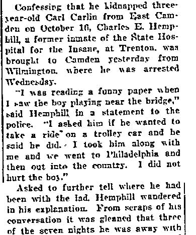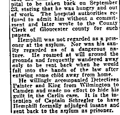 EXTRA ASHBRIDGE CAUGHT IN CHESTER HOTEL ALONG WITH WIFE Fugitive Murderer Waives Extradition and Detective Schregler Brings Couple to Camden in Motor Car PAIR REGISTERED IN EARLY MORNING Captured at noon with his wife in the Keystone Hotel at Chester PA, Wilson Ashbridge, who escaped from the County Prison last night with George E. Thompson, a forger, after killing Jailor Hibbs and shooting Jailor Ellis, is again in the County Jail. Ashbridge admits that he shot both men. He said the gun was given to him by Thompson. The coupe were captured in their room at the Keystone Hotel by Captain of Detectives Schregler and Policeman david hunt, who hurried to chester in Chief Gravenor's automobile in receipt of a message that a man answering to the description if the published picture of Ashbridge registered there early this morning with a woman as his wife. Ashbridge offered no resistance when the officers entered his room. He waived extradition and being handcuffed was placed in the machine with his wife and hurried to this city. Schregler sat in the rear of the machine between Ashbridge and his wife. They reached City Hall at 2:10 o'clock this afternoon. Ashbridge was smoking a cigarette and looked sullen. When the murderer saw a battery of photographers getting ready to take their pictures, Ashbridge shielded his wife's face with his hat and hid his own face as best he could in his handcuffed condition. They were taken upstairs to the Chief's office and later sent to the Prosecutor's office. Ashbridge takes blame for the double shooting, but insists that his wife did not give him the gun, saying that Thompson supplied the weapon. The police knew last night that Mrs. Ashbridge was with her husband or intended to go with him. This information came in a letter turned over to the police by a Mrs. Dick, of East Camden, who was carting for the children. The envelope cautioned her not to open the letter until 7:00 o'clock last night. Mrs. Ashbridge said in the note that she was going to do a rash act and might not see the children again. In the cell occupied by Thompson the following note was found by Detective Painter. "Ashbridge has made up his mind to leave this place. I have decided to go with him. "It may seem like suicide and if anything happens send my body to the University of Pennsylvania" "THOMPSON" Seventeen loaded cartridges were also found in the cell. The detectives and their prisoners were accompanied to Camden by E.S. Fry, proprietor of the Chester hotel, where the couple were caught. There is no question but that Mrs. Ashbridge knew all bout the plan to escape. Where she met her husband has not been discovered. A reward of $1,000- $500 for each- was today offered by the Prosecutor. |