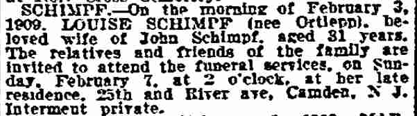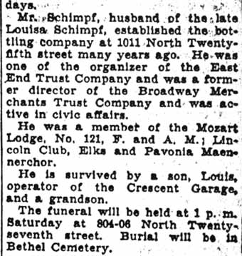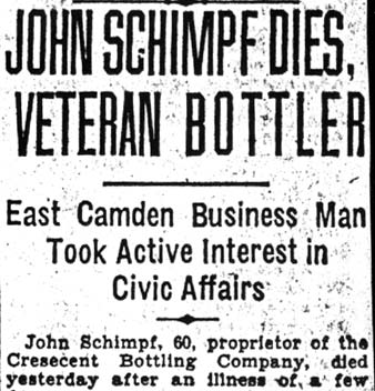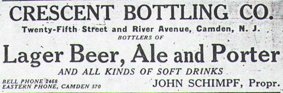 JOHN SCHIMPF was born in Dreihausen, Germany in 1865. He came to America at the age of 15. After working in a North Dakota lumber camp and as a government stage driver, he came to Camden NJ. A John Schimpf is listed in the 1890-1891 Camden City Directory as living at 234 Burns Street, in the Poet's Row section of North Camden. He was then working as a shovelmaker in Philadelphia. Shortly before the 1896 City Directory was compiled, John Schimpf moved to the Cramer Hill section of Camden, where he went to work as a driver for Christopher L. Dietz, who had founded the Crescent Bottling Company on River Avenue at Fulton Street (present-day North 25th Street) in 1893. John Schimpf eventually took over management and ownership of the business. Christopher Dietz passed away in September of 1900. John Schimpf married Louisa Ortlepp, and they had a son named Louis, born August 19, 1903. Sadly, Louisa Schimpf passed away February 3, 1909, ten days short of her 31st birthday. John Schimpf was very active in the civic and business life of Camden. He was a director of the Broadway Merchants Trust Company bank, and, with Dr. C.F. Hadley and Frederick von Nieda among others, co-founded of the East End Trust in 1905. He was a member of mozart lodge no. 121 f&am, the germania maennerchor, the Improved Order of Red Men, the Lincoln Club, and the Elks. At the time of the 1920 Census, Louis Schimpf was working with his father in the bottling business. Seeing an opportunity in the auto repair business, the Schimpfs founded the Crescent Garage auto repair business in the 1920s. This business remains a successful garage today, and has been known popularly since the 1930s simply as Schimpf's. John Schimpf passed away on December 3, 1935 after a short illness. He was buried at Bethel Cemetery in Pennsauken NJ. Among his pallbearers were Camden Mayor Frederick Von Nieda, and many other members of Camden's German- American community. He was survived by a sister, Anna, in Germany, and his son Louis. |