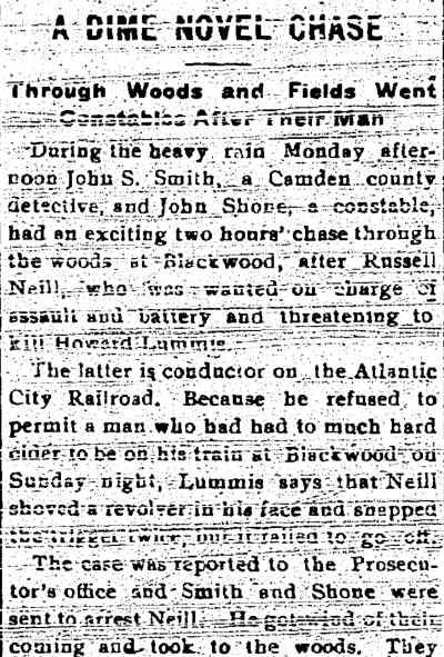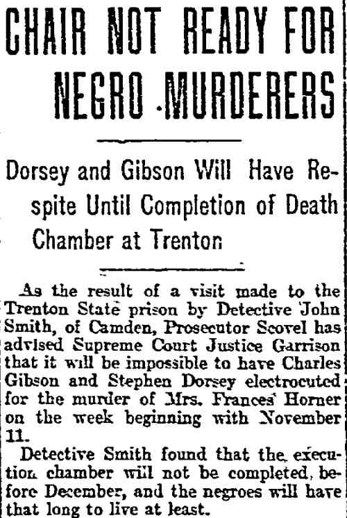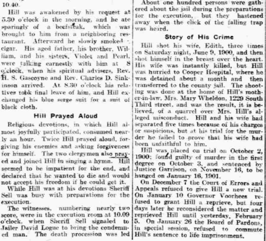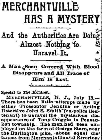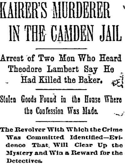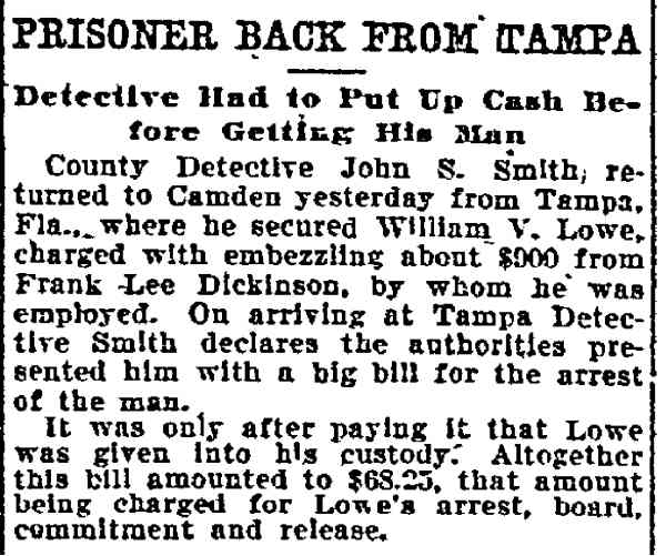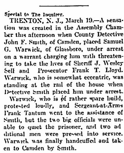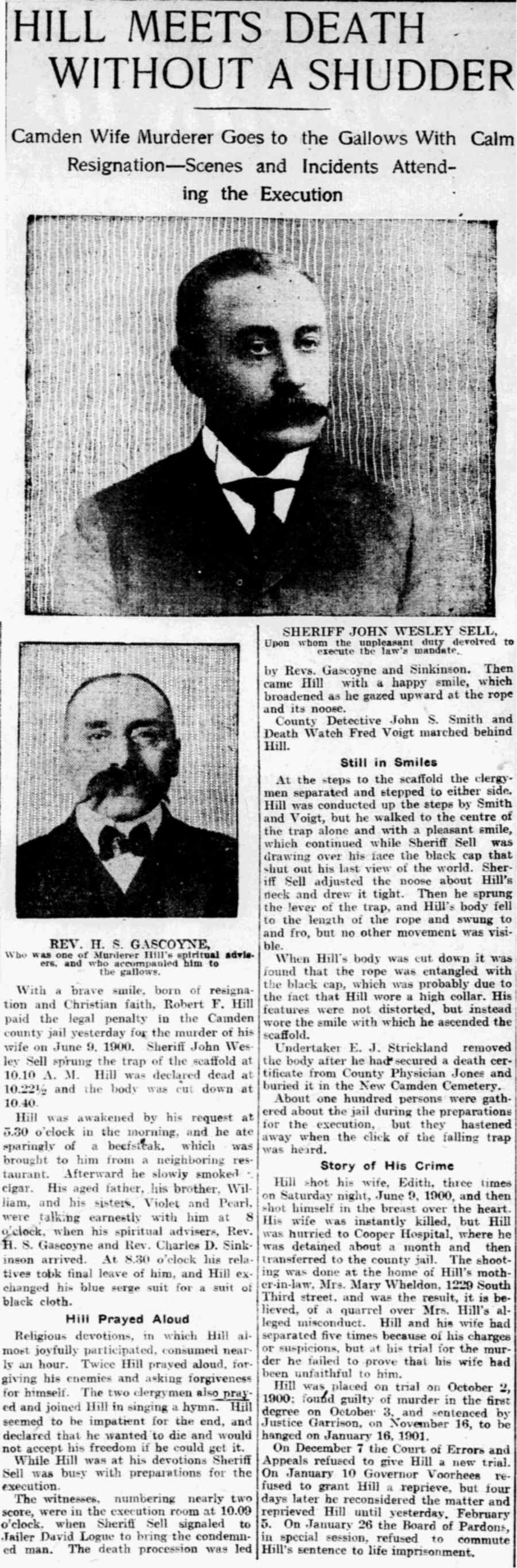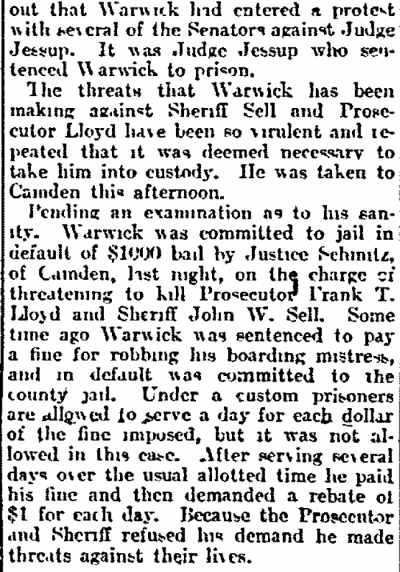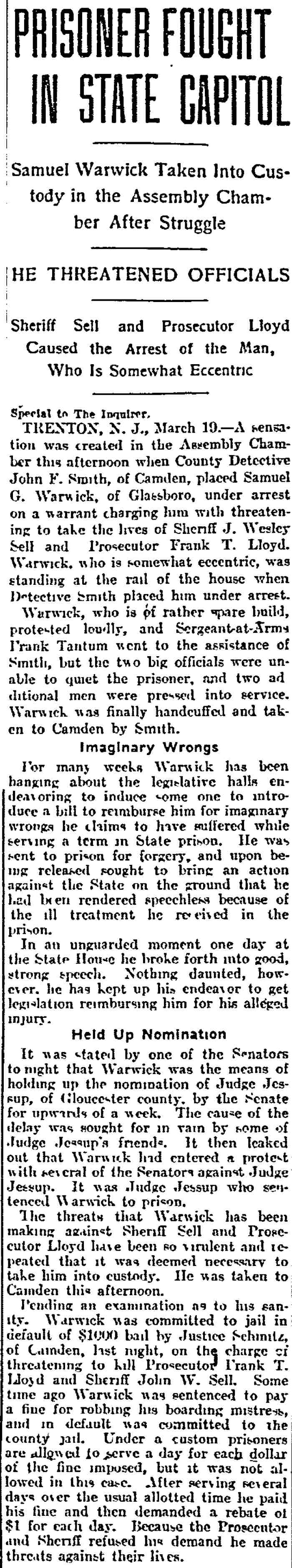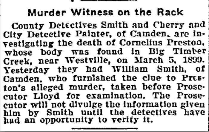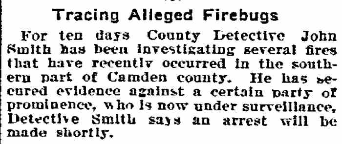 l l l l l l l l l l On October 1, 1902 Paul Woodward murdered two young boys by giving them poison. Frank T. Lloyd, then Camden County prosecutor, was responsible for leading the investigation and prosecuting the case. County Detective Cherry was involved in the investigation. Woodward was arrested on October 4, 1902. Detective Cherry was present later that day when Woodward was identified as being seen with the two victims. Woodward was indicted, tried, convicted of murder in the first degree, and on January 7, 1903 executed at the Camden County Jail.