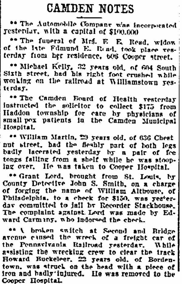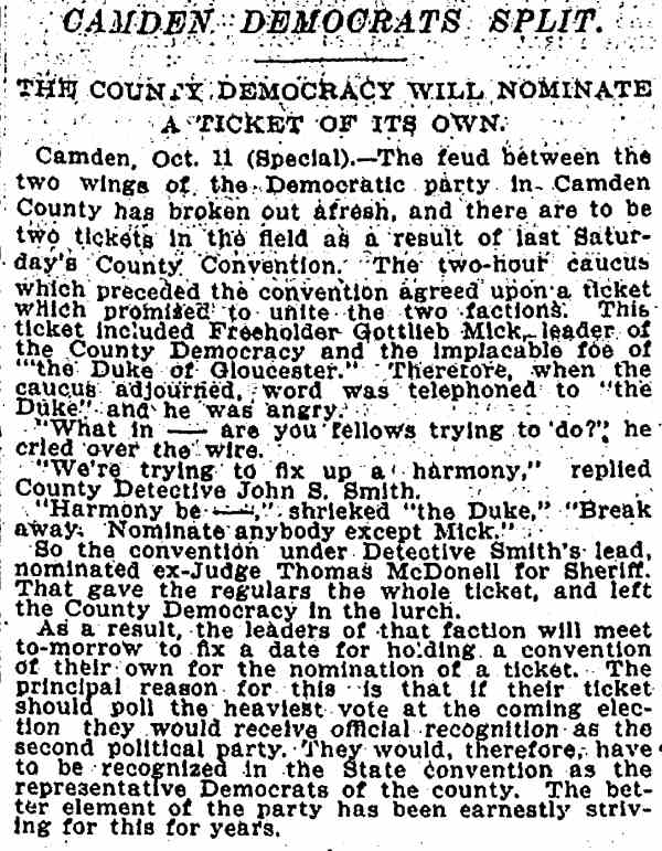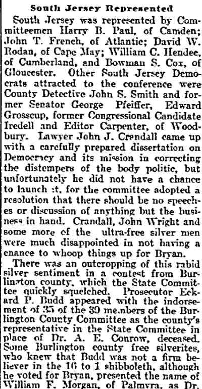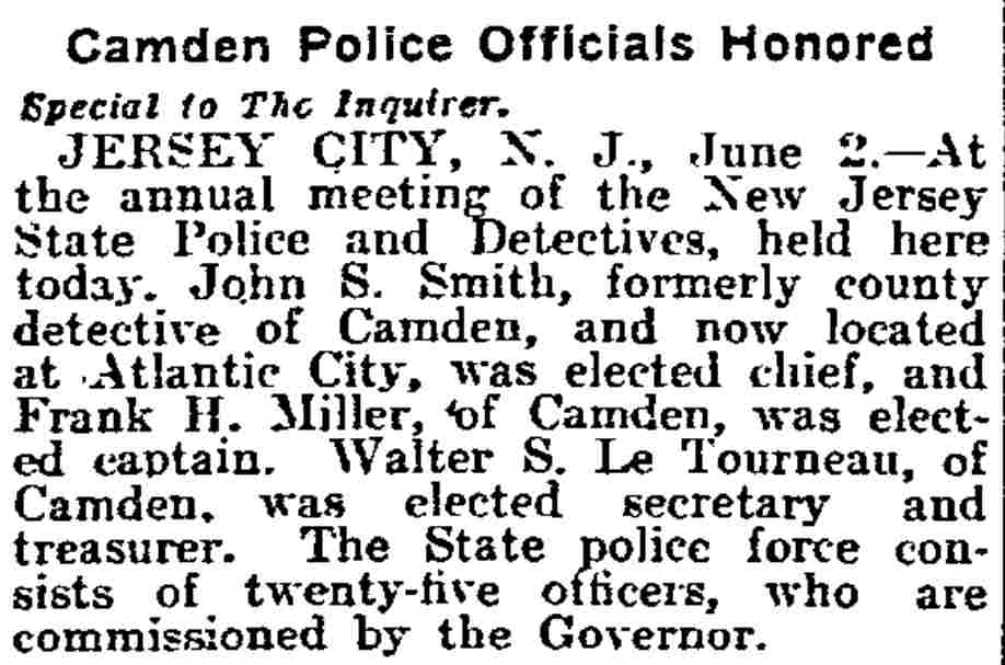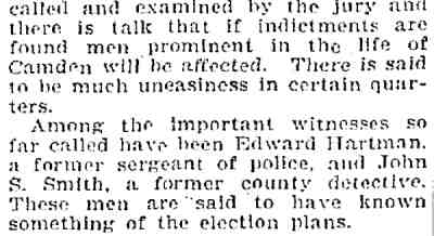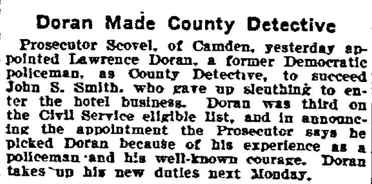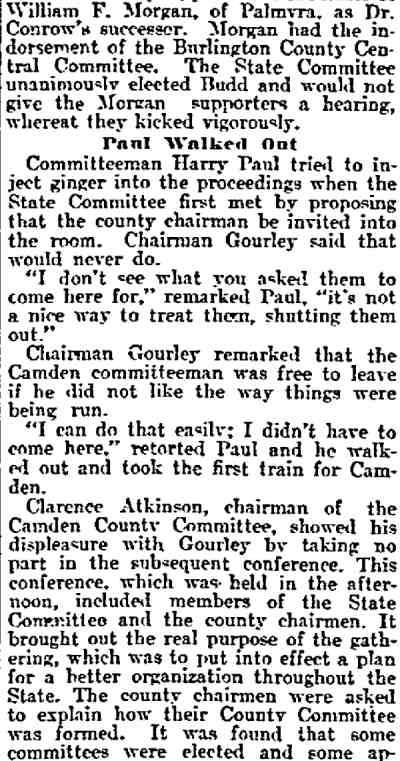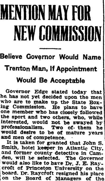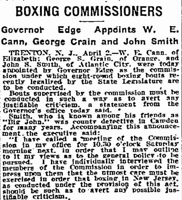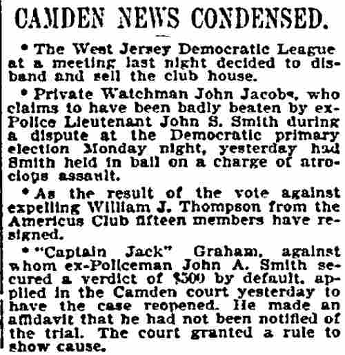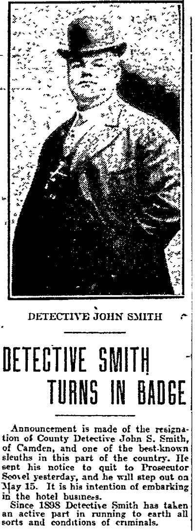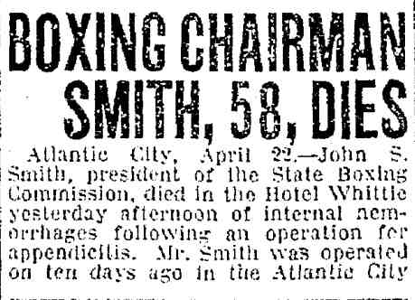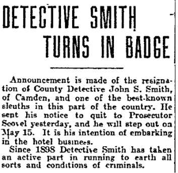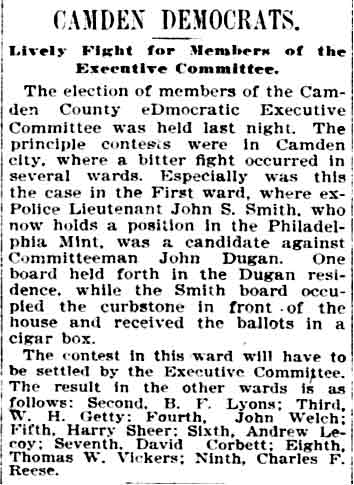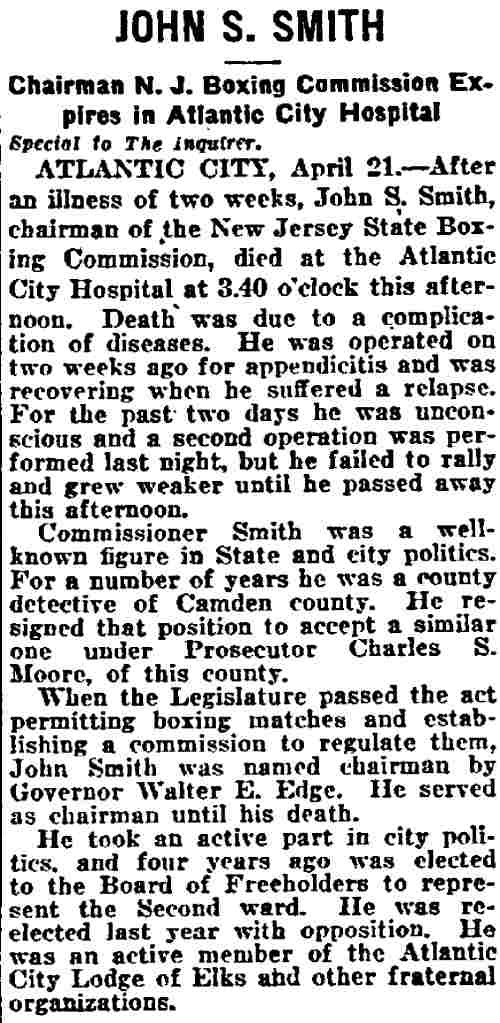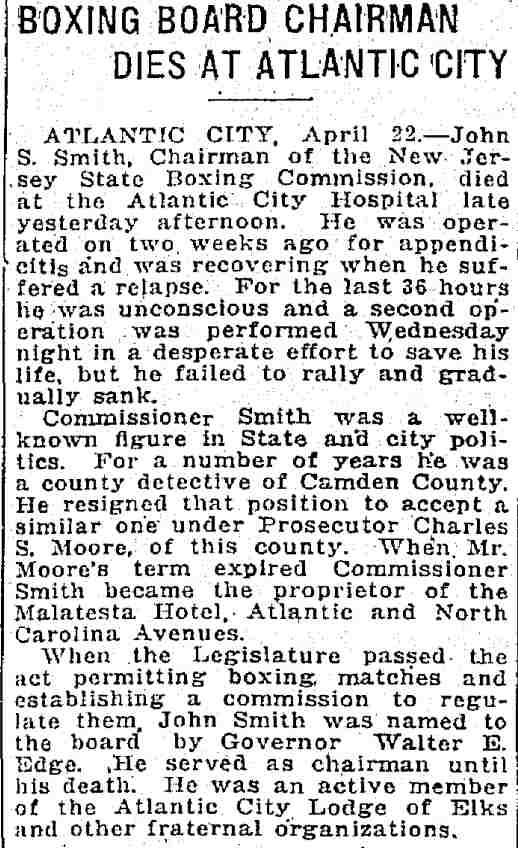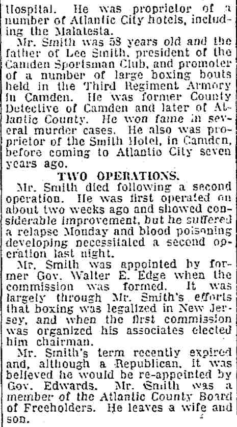 Excerpt from Dan McConnell's column: A CHIP OFF THE OLD BLOCK The axiom of like father, like son is particularly apt in the life of F. Lee Smith, new Democratic leader of Delaware Township. His is a political heritage handed down by his late father the beloved John S. Smith, former Camden County detective and first boxing inspector, who later was a freeholder in Atlantic County when he operated the once-famous Malatesta Hotel. Until his death the elder Smith was affectionately known as “Rye Beach” Smith. For many years, when this writer was the skipper of a 16-foot sailing skiff that skimmed over the then non-polluted waters of the placid Delaware River, the elder Smith operated a tavern in a section nicknamed “Rye Beach”. The beverage bistro was the meeting place of all North Camden fight and baseball fans and the walls were adorned with greats of the prize ring and baseball diamonds of those pristine days. The place afterwards was a gospel mission. Later John Smith opened a more ornate drinkery at Fourth and Federal Streets. The sports celebrities and the faithful gathered there. It was a meeting place for veteran newspapermen, who quaffed amber brew from long stems. In those days officials in positions to enforce the law had no qualms about petty gambling. A popular game at Smith's tavern was played with an electric fan, the blades of which were numbered. The older newspaper boys passed the time away playing for the cost of the drinks. Carry on, F. Lee Smith. |
