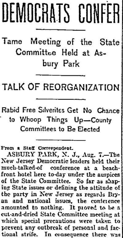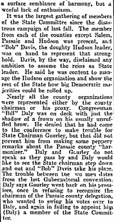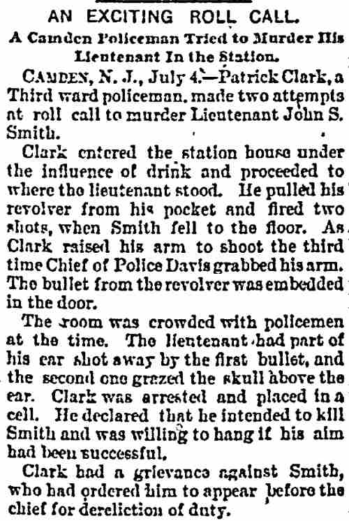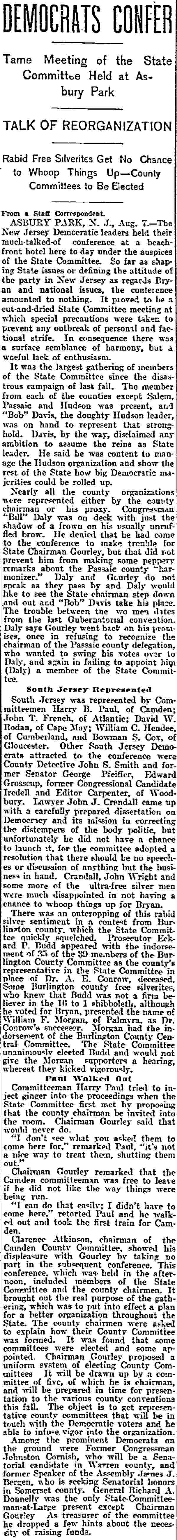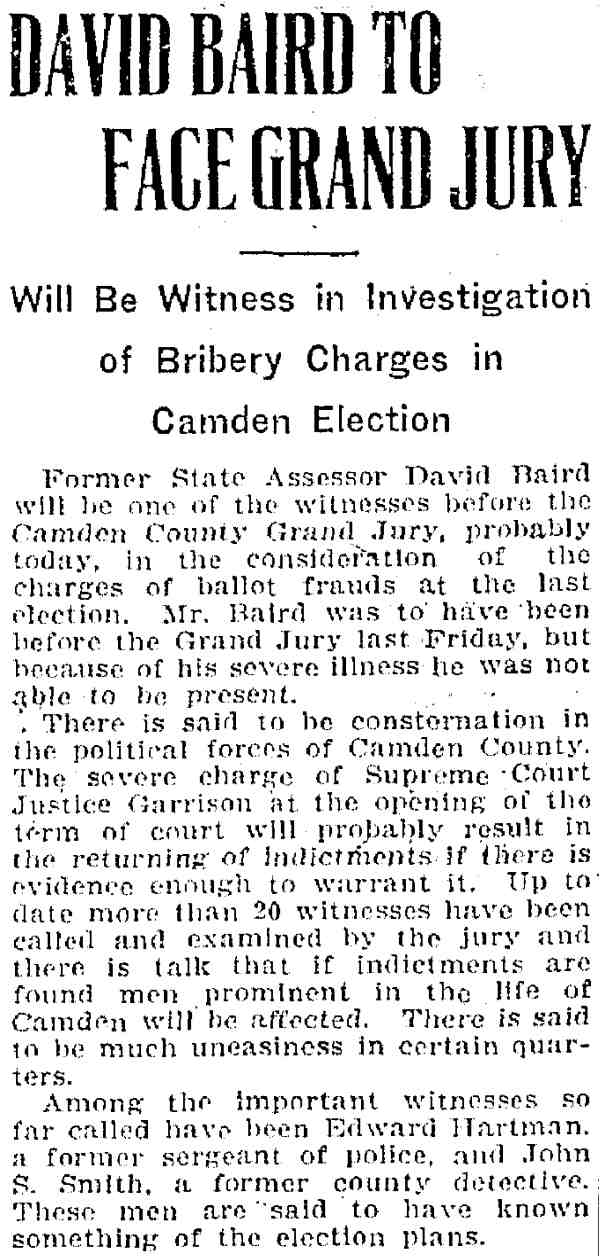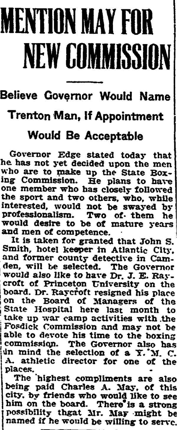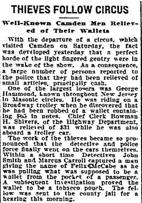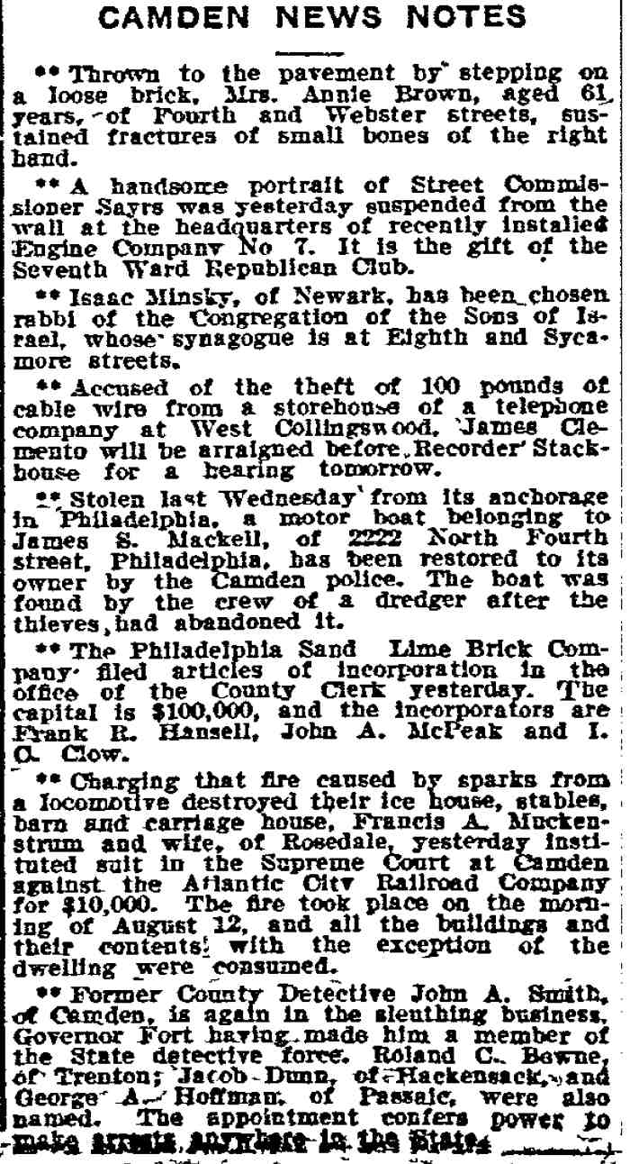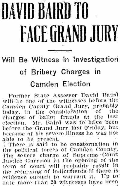 Excerpt from Dan McConnell's column: A CHIP OFF THE OLD BLOCK The axiom of like father, like son is particularly apt in the life of F. Lee Smith, new Democratic leader of Delaware Township. His is a political heritage handed down by his late father the beloved John S. Smith, former Camden County detective and first boxing inspector, who later was a freeholder in Atlantic County when he operated the once-famous Malatesta Hotel. Until his death the elder Smith was affectionately known as “Rye Beach” Smith. For many years, when this writer was the skipper of a 16-foot sailing skiff that skimmed over the then non-polluted waters of the placid Delaware River, the elder Smith operated a tavern in a section nicknamed “Rye Beach”. The beverage bistro was the meeting place of all North Camden fight and baseball fans and the walls were adorned with greats of the prize ring and baseball diamonds of those pristine days. The place afterwards was a gospel mission. Later John Smith opened a more ornate drinkery at Fourth and Federal Streets. The sports celebrities and the faithful gathered there. It was a meeting place for veteran newspapermen, who quaffed amber brew from long stems. In those days officials in positions to enforce the law had no qualms about petty gambling. A popular game at Smith's tavern was played with an electric fan, the blades of which were numbered. The older newspaper boys passed the time away playing for the cost of the drinks. Carry on, F. Lee Smith. |