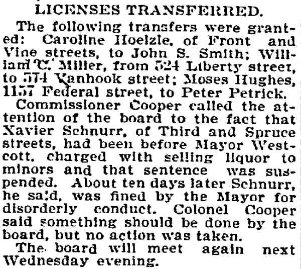 William C. Miller - Moses Hughes Peter Petrick - front street - vine street - Liberty Street mechanic street - Federal Street - Xavier Schnurr - south 3rd street - spruce street - John L. Westcott - Colonel William Cooper |